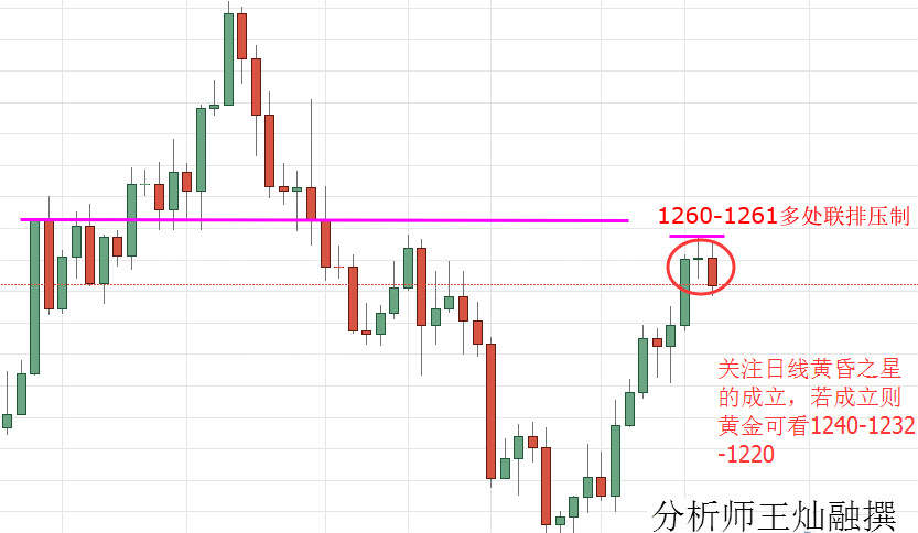 日线上大阳拉升打开布林上轨空间,上轨出现向上开口运行,5日10日均线维持金叉势头,5日均线直线上行至1256位置,K线一直踩着5日均线走高,MACD红柱能延续放量。四小时前期受1259空头阻力承压一度走低至1244得以布林下轨支撑,多头迎来三连阳的反弹上攻,最终连续的小阳后迎来大阳直线拉升一举上破1259附近联排阻力区至1260上方运行,操作上王灿融建议以回落做多为主,顺势而为,下方关注1258关键点与1255防守点即可,上方关注1270一带阻力