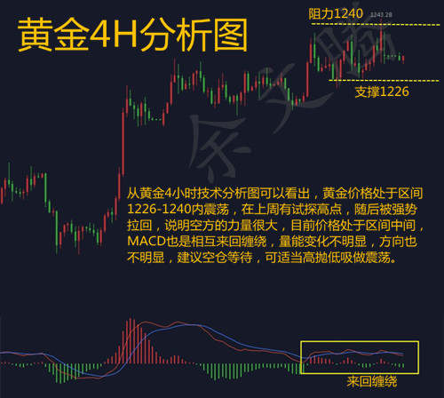 从黄金4小时技术分析图可以看出,黄金价格贴近震荡区间底部支撑1226处,同时MACD指标显示绿色动能柱在增量后,有缩量的迹象,说明黄金下跌的动能不足,将有大概率会反弹上涨。