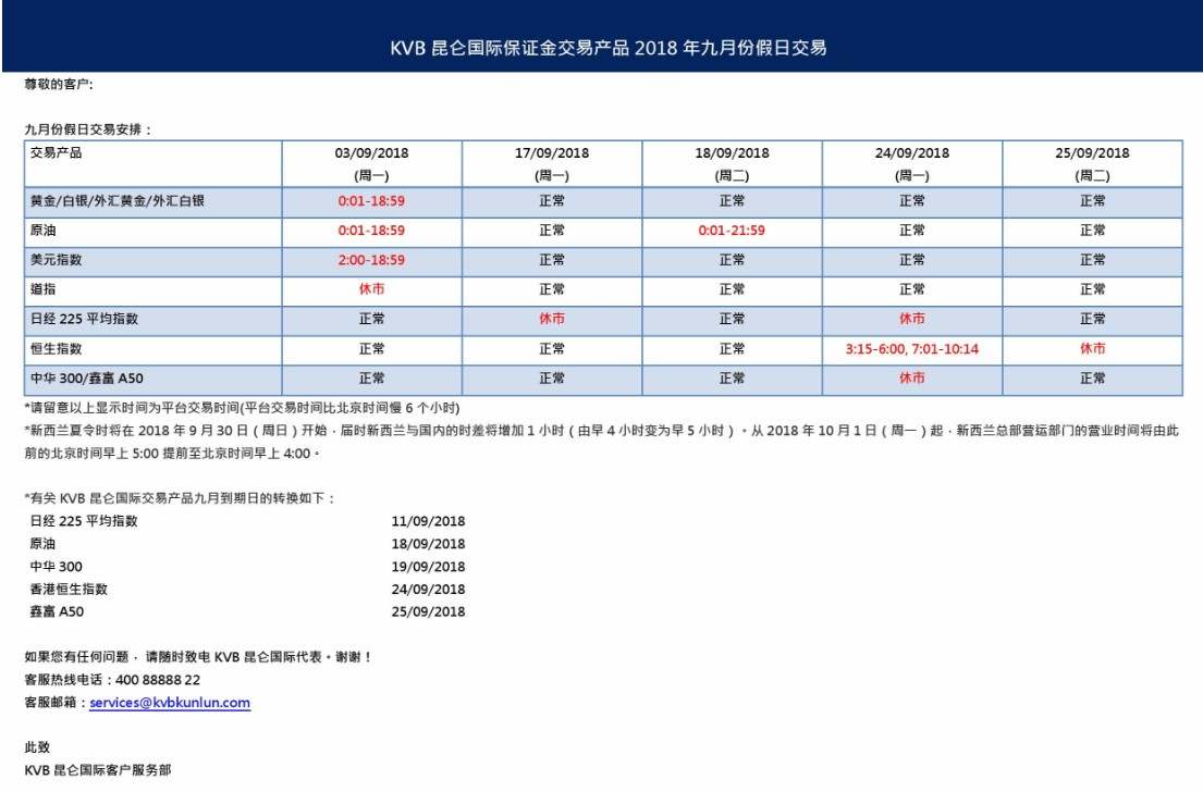 自2019年4月7日(周日)起,KVB昆仑国际将针对FX产品交易时间进行调整。如下表所示,系统时间每周日22:00至23:59期间将无法进行FX产品交易,交易起始时间将调整为系统时间周一00:01.详情请参考ForexStar交易软件中的产品规格信息。