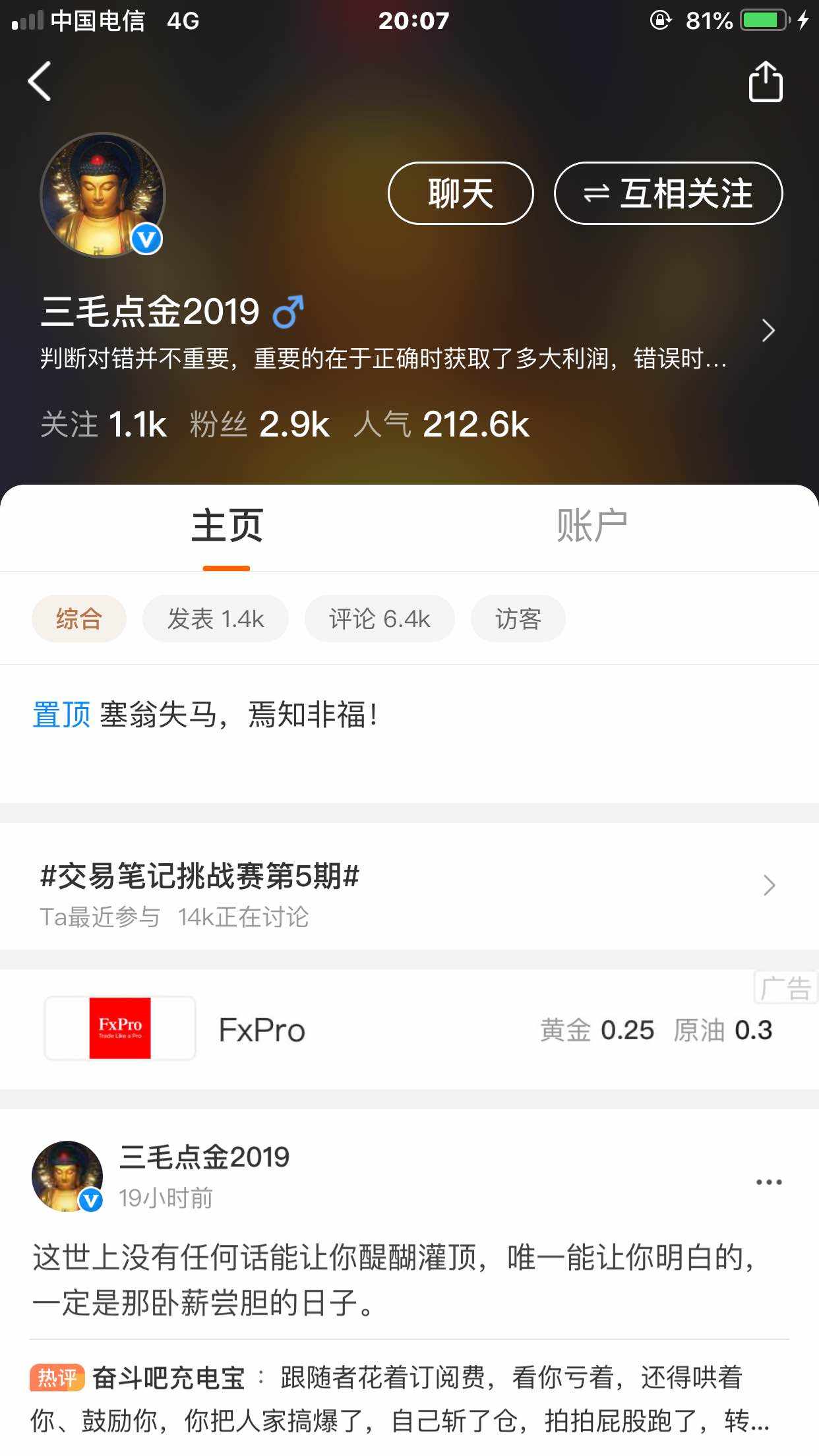 来到平台断断续续🈶️一年多了,见过的大神一波又一波,最后无一幸免的亏损爆仓消失,跟随的几乎没有赚钱的,特别是这个三毛总,总是侃侃而谈,聊天几乎无时不在,做单就不用提了,除了重仓薅羊毛,没有看到🈶️什么技术,特别上一周重仓金子空从1681到1698加仓🈶️6单,损失不必说了……
