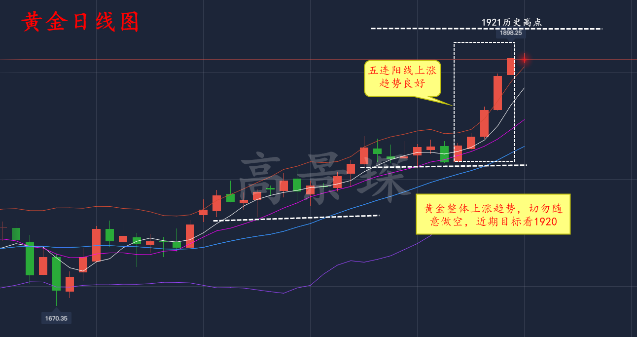 行情反弹结束也是黄金投资者做空较好的时机,当金价走势运行到一定的低位时,价格一般会出现反弹,而一般反弹到一定高度又会承压下跌,会使黄金价格反弹受压的点位一般有均线;布林上轨;盘整行情上方的阻力线;近期内的价格高位等。