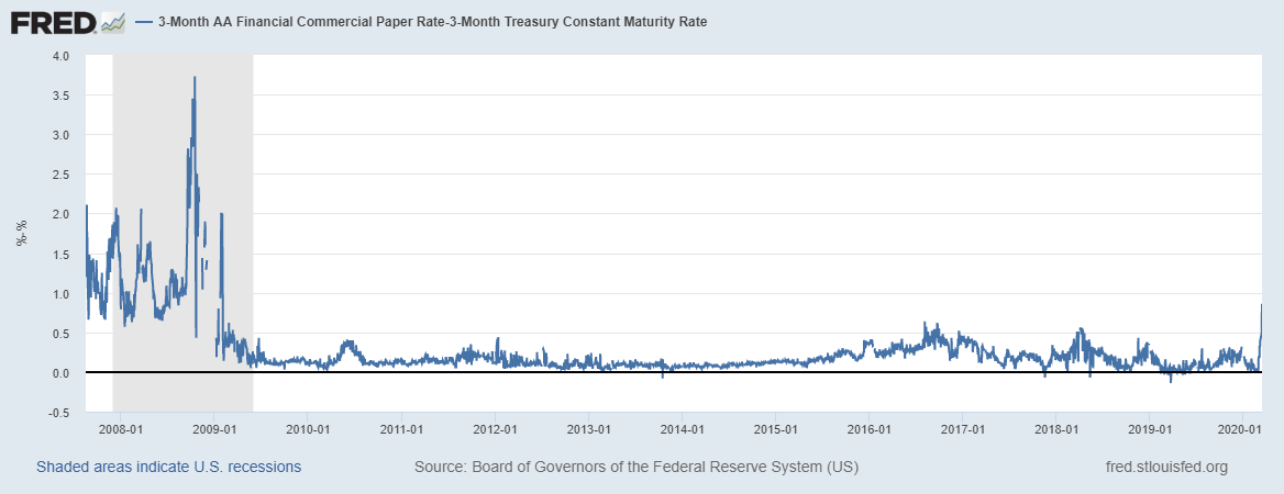 尽管存在重大差异,但当前的恐慌确实与2008年的金融危机有共同点。在2008年金融危机期间,这场危机的根源在于金融部门。抵押贷款市场的激励问题最终导致人们对一类资产支持证券的价值失去信心,这导致资产价格下跌,金融市场逃避安全,以及违约和潜在违约链。当前的危机根源于非金融部门,但其中一些因素也在发挥作用。企业和个人收入流量的减少或预期减少,已导致这些企业和个人重新评估其投资组合,从而产生了在资产市场进行交易的愿望。但与此同时,每个人都对结果非常不确定,以及风险在哪里。因此,人们认为风险很高,通常来说,市场参与者正在逃离安全资产,人们也希望出售流动资产,以他们认为最佳的方式调整其投资组合。发生了什么?首先,就像在金融危机中一样,利率差也在增加。这是3个月商业票据利率和T-bill利率之间的差异: