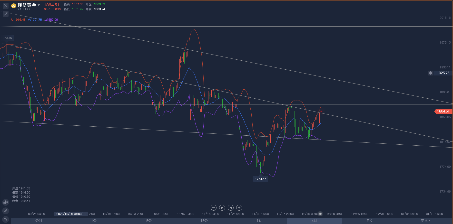 我是一直对于黄金多头的观点至今未变,只要中期守住1863第一次调整低点,多头趋势就不会变,虽然日线在多数人看来均呈空头放量走跌的行为,但为何近期的金价未能造成强势的抛售?并且在得到触底后得以回升?这些问题都是需要思考的。技术面来看,黄金短期已经震荡一月有余,目前还在三角整理延续中,不过低点在逐步上移,本周底部支撑上移至1920-1915,而4小时目前处于震荡节奏当中,K线结构并看不出明显的单边延续,布林轨进入收缩状态当中,考虑到上方下行趋势线的压力,短线相对偏空一些。