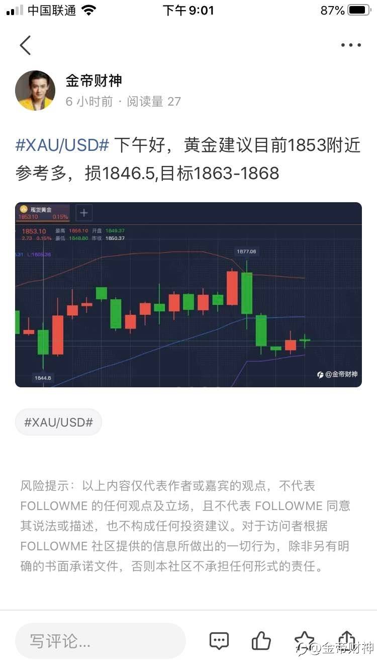 金帝财神 22 Oct 2020, 16:31 · 阅读量 342 关注 本周前20个日期的交易情况,获利6000美金,有问题可以私信,或者跟随做单 风险提示:本文所述仅代表作者个人观点,不代表 Followme 的官方立场。Followme 不对内容的准确性、完整性或可靠性作出任何保证,对于基于该内容所采取的任何行为,不承担任何责任,除非另有书面明确说明。 赞赏作者 喜欢的话,赞赏支持一下