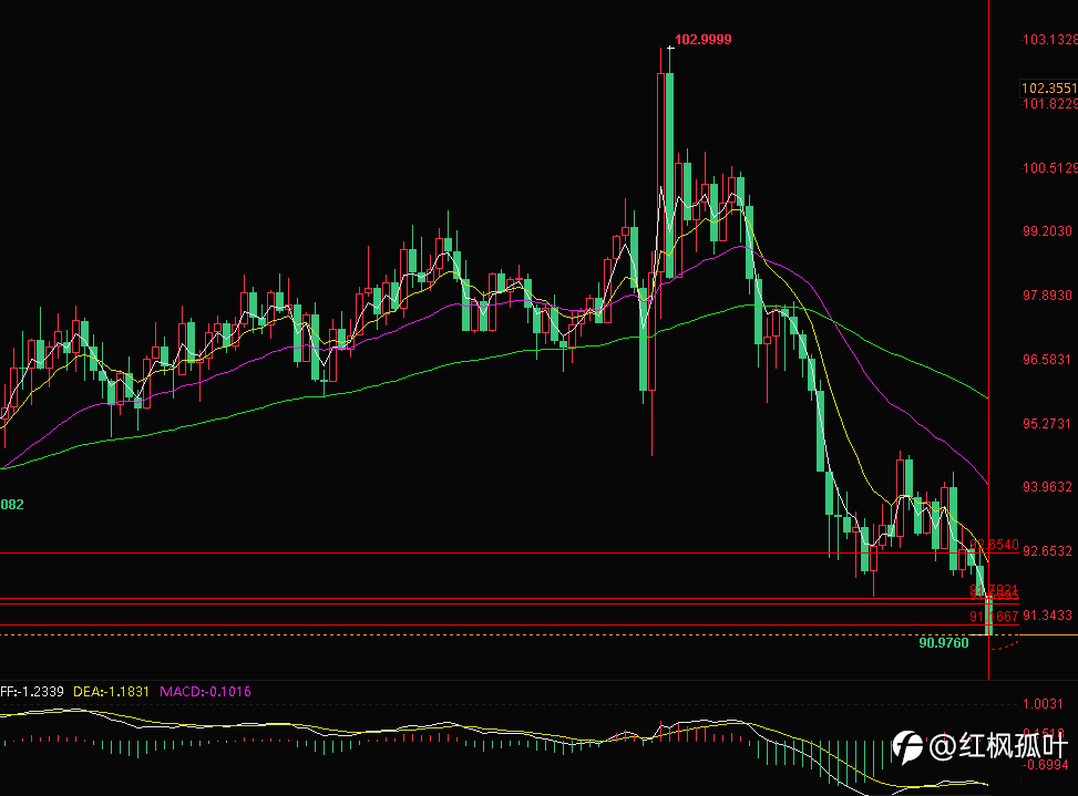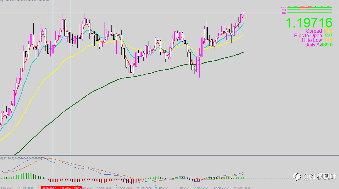 天图上,短期均线已突破中枢平衡区的上限,预示着至少还有一波上涨,小时图上长期均线向下收缩走平,等待长期选择方向是继续向下回调还是反弹向上。