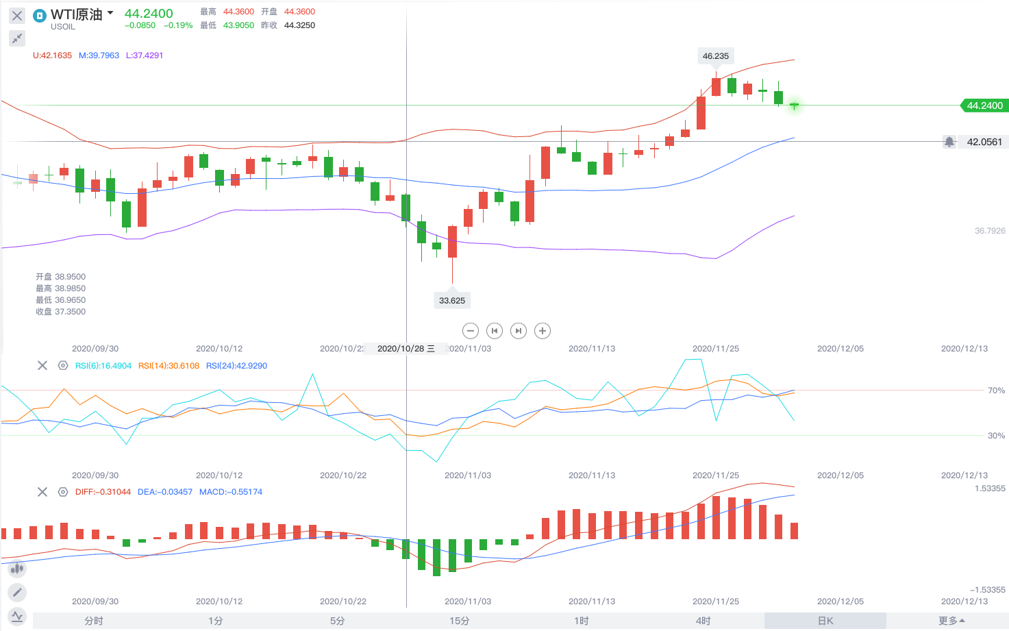 技术面上来看,现货黄金四小时从11月23号至今收成了一条“项链”的形状,但并还未到达“对称”点位,MACD快慢线还在持续走多头趋势,布林带现在呈开口状态,今日开盘后K线运行在布林带上轨之上,0点时K线更曾试探1868点位,已于上上周一晚间欧盘最高价持平。接下来黄金会将突破1868再创更高点位吗?