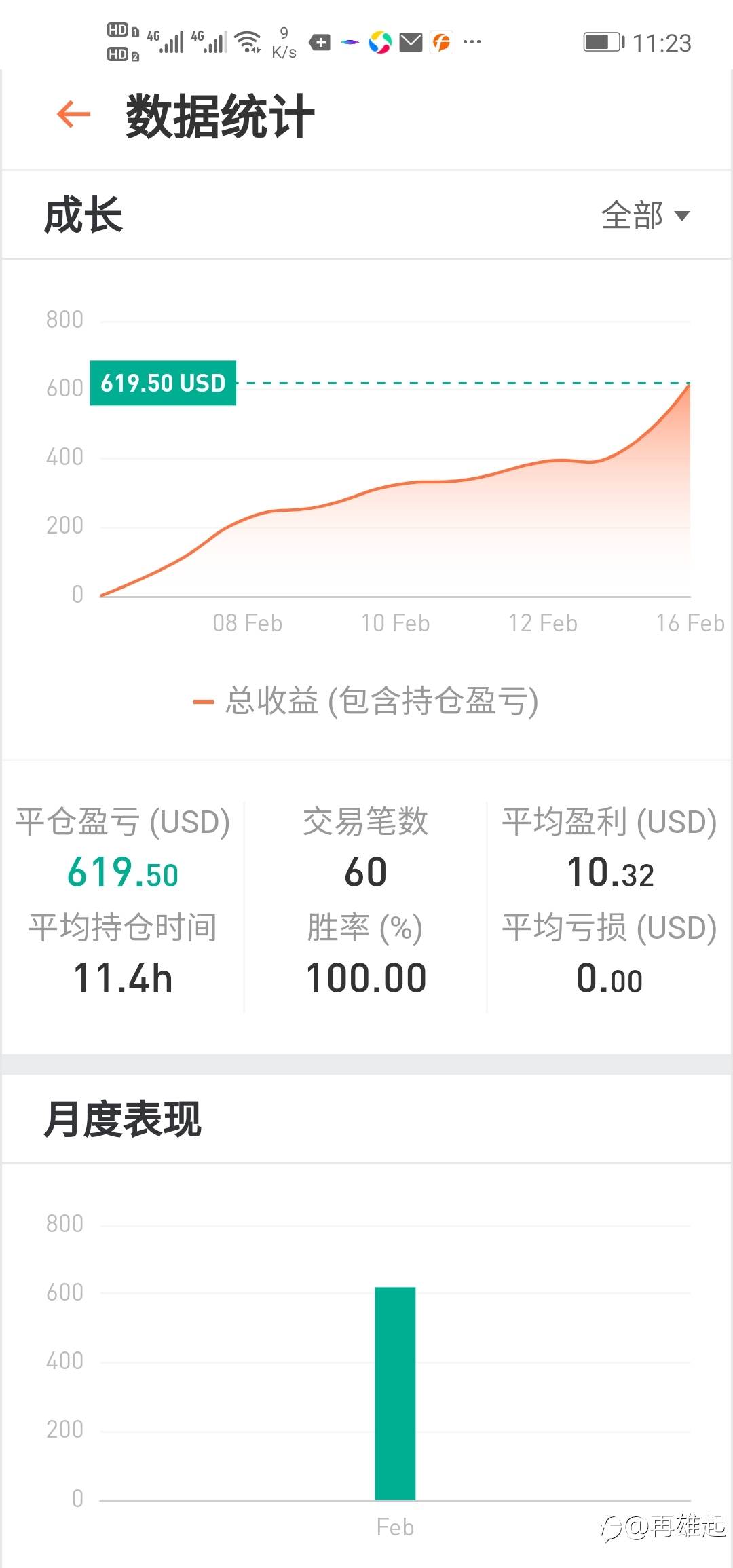再雄起 13 Feb 2021, 08:31 · 阅读量 1,019 关注 伦敦现货黄金入金1000美元第七天,今天是大年初一,牛年的第一天,盈利51.25美金,实现了开门红!总盈利390..65.收益率39%,交易42笔全部盈利,全平台排名第六位[胜利][胜利][胜利]实行平稳盈利路线[色][色][色]敬请关注 风险提示:本文所述仅代表作者个人观点,不代表 Followme 的官方立场。Followme 不对内容的准确性、完整性或可靠性作出任何保证,对于基于该内容所采取的任何行为,不承担任何责任,除非另有书面明确说明。 赞赏作者 喜欢的话,赞赏支持一下