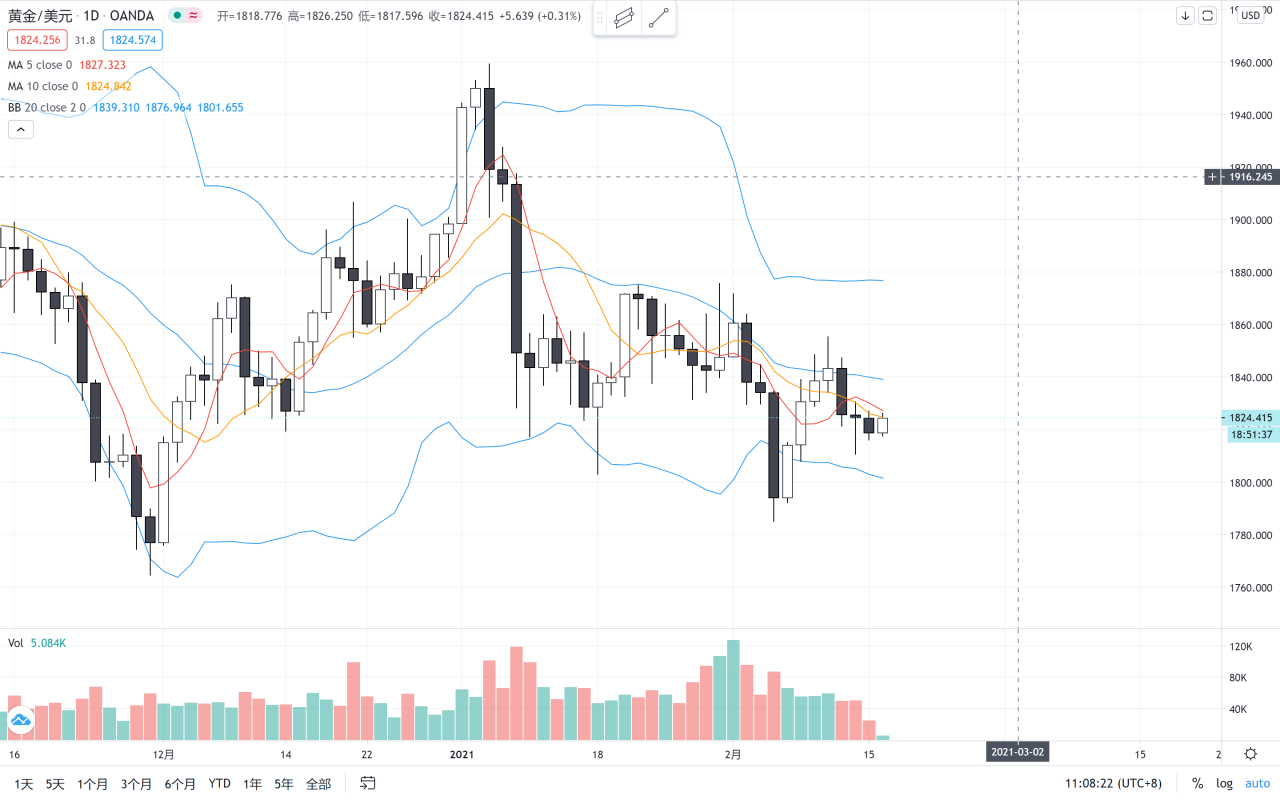 指标方面布林带三轨走势仍旧整体朝下,且布林带中轨在K线上方形成阶段阻力,意味黄金若短线拉升,多头情绪或将在1820附近遭受空头力量打压。另外,五日均线虽走势转上,但十日均线仍处于下行,若多头力量未能展现出企稳的信号,短线金价仍存在再次下行的可能。