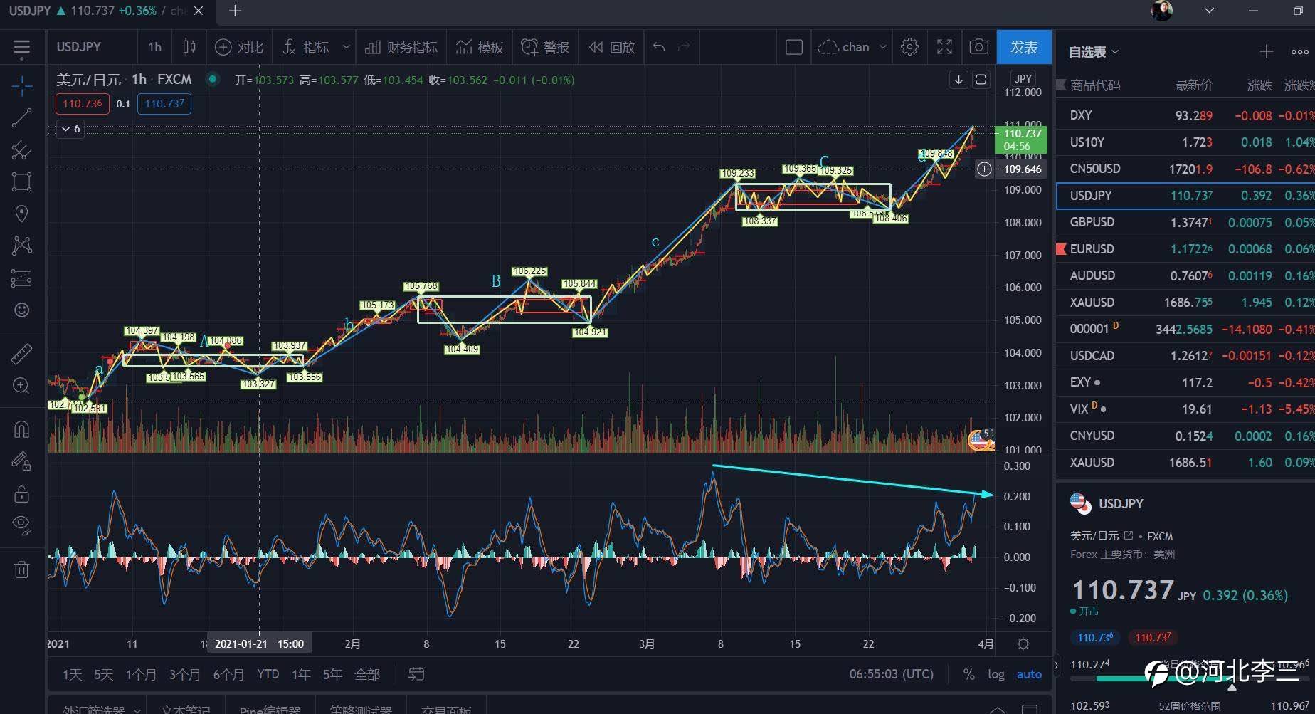 a段与b段构成盘整中枢,其长度及对应的黄白线与绿柱子背驰并不明显,但b段中的两段向下走势出现明显背驰,所以要密切注意小转大的可能,也就是这段背驰反弹力度。