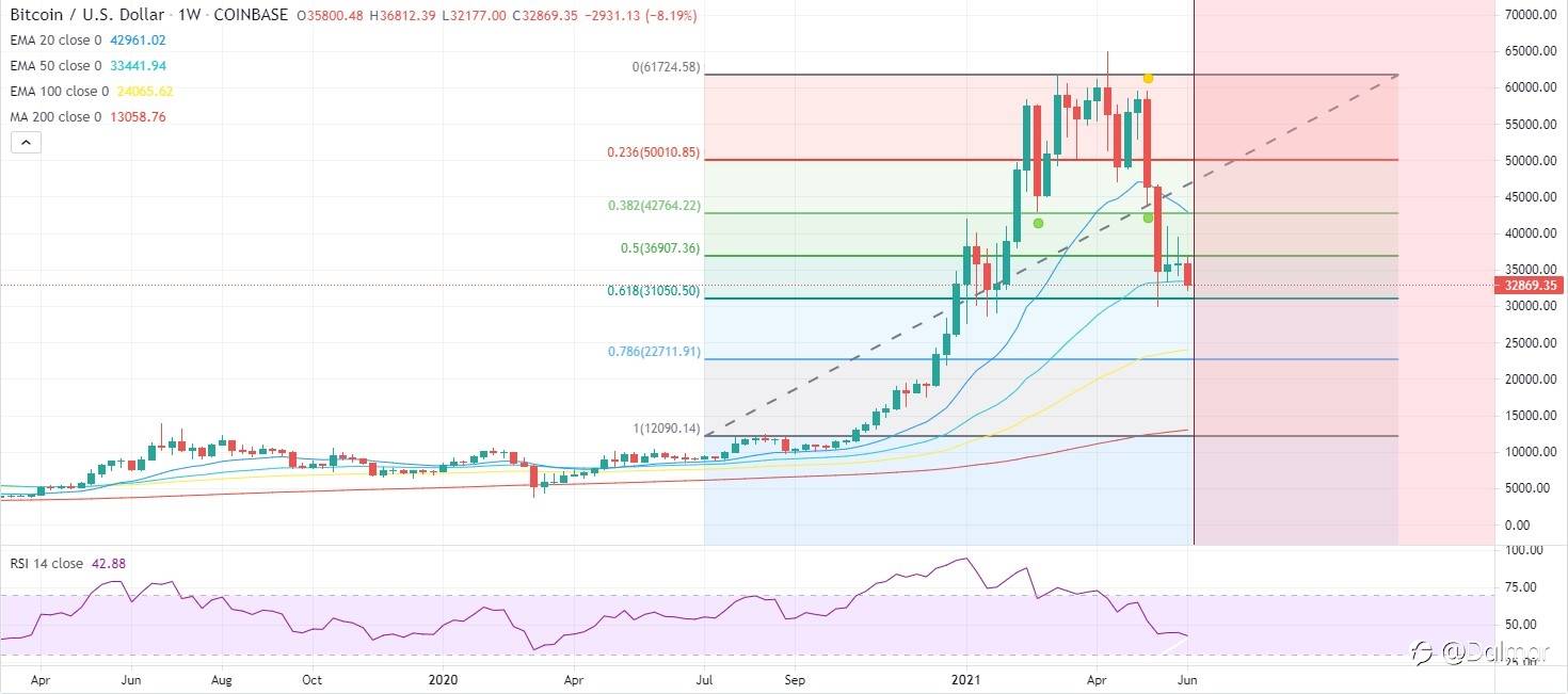 On the downside, BTC is trying to sustain above its 50-WEMA which is placed at $33.4K, however, if we get a decisive closing below this level, the next significant support is present at $30K as 0.618 Fibonacci retracement level is present here, followed by the next major support at $27.7K