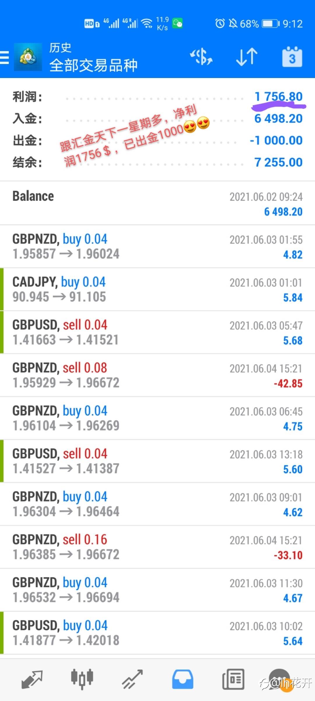 lh花开 15 Jun 2021, 09:44 · 阅读量 806 关注 一星期多,已出金1000$ 风险提示:本文所述仅代表作者个人观点,不代表 Followme 的官方立场。Followme 不对内容的准确性、完整性或可靠性作出任何保证,对于基于该内容所采取的任何行为,不承担任何责任,除非另有书面明确说明。 赞赏作者 喜欢的话,赞赏支持一下