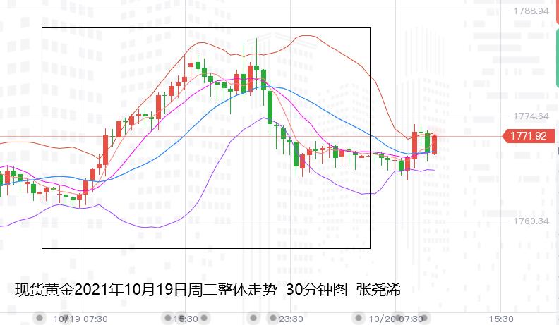但美国10月消费者信心意外增强,提振了美元和美股,市场就此再度连续出现4波抛售潮的打压,并再度承压走低,连续回落于22点录得日内低点1782.41美元,终由于通胀导致的美债收益率再度转跌收阴,道指也高开低走收阴,而止跌有所触底反弹,收于1792.53美元,日振幅24.93美元,收跌14.81美元,跌幅0.82%。