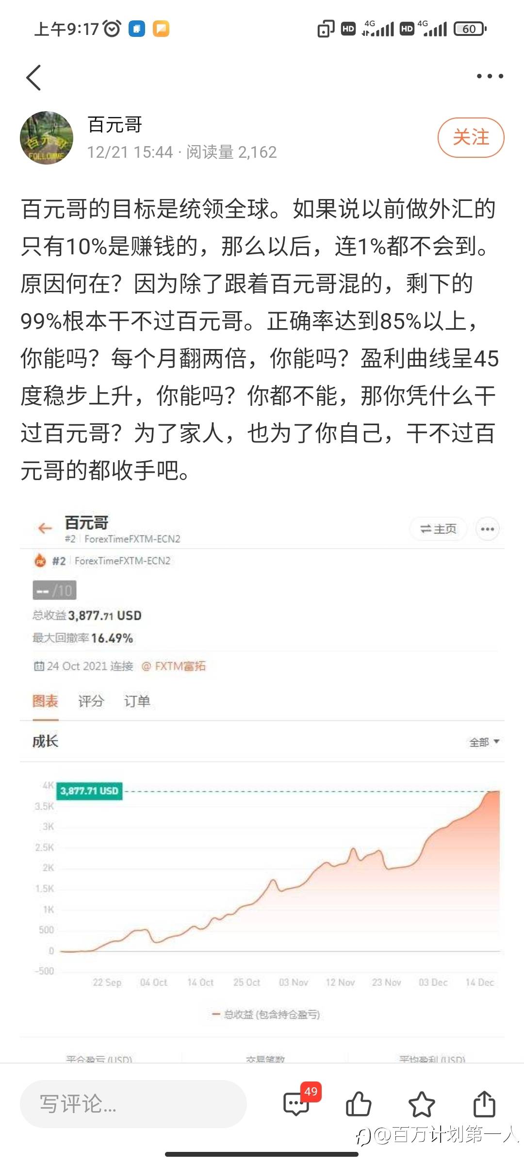 百万计划第一人 29 Dec 2021, 11:16 · 阅读量 1,794 关注 现在你还觉得我是吹牛吗?TMBKZ战法就是这么牛逼!! @百元哥@resse 风险提示:本文所述仅代表作者个人观点,不代表 Followme 的官方立场。Followme 不对内容的准确性、完整性或可靠性作出任何保证,对于基于该内容所采取的任何行为,不承担任何责任,除非另有书面明确说明。 赞赏作者 喜欢的话,赞赏支持一下