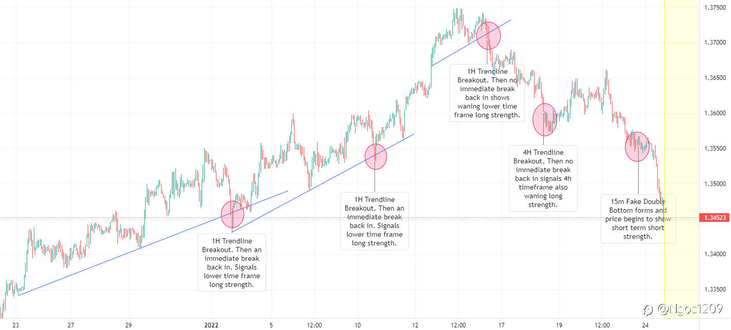 Như bạn có thể thấy trong biểu đồ, trong quá trình di chuyển dài ban đầu, liên tục có các dấu hiệu về sức mạnh kéo dài trên biểu đồ 1h với đường xu hướng bị phá vỡ, sau đó ngay lập tức phá vỡ trở lại đường xu hướng. (Phá vỡ ngay lập tức có nghĩa là: mức giá đóng cửa của nến bứt phá và điểm bứt phá trở lại khi nến mở cửa ở cùng một mức giá)