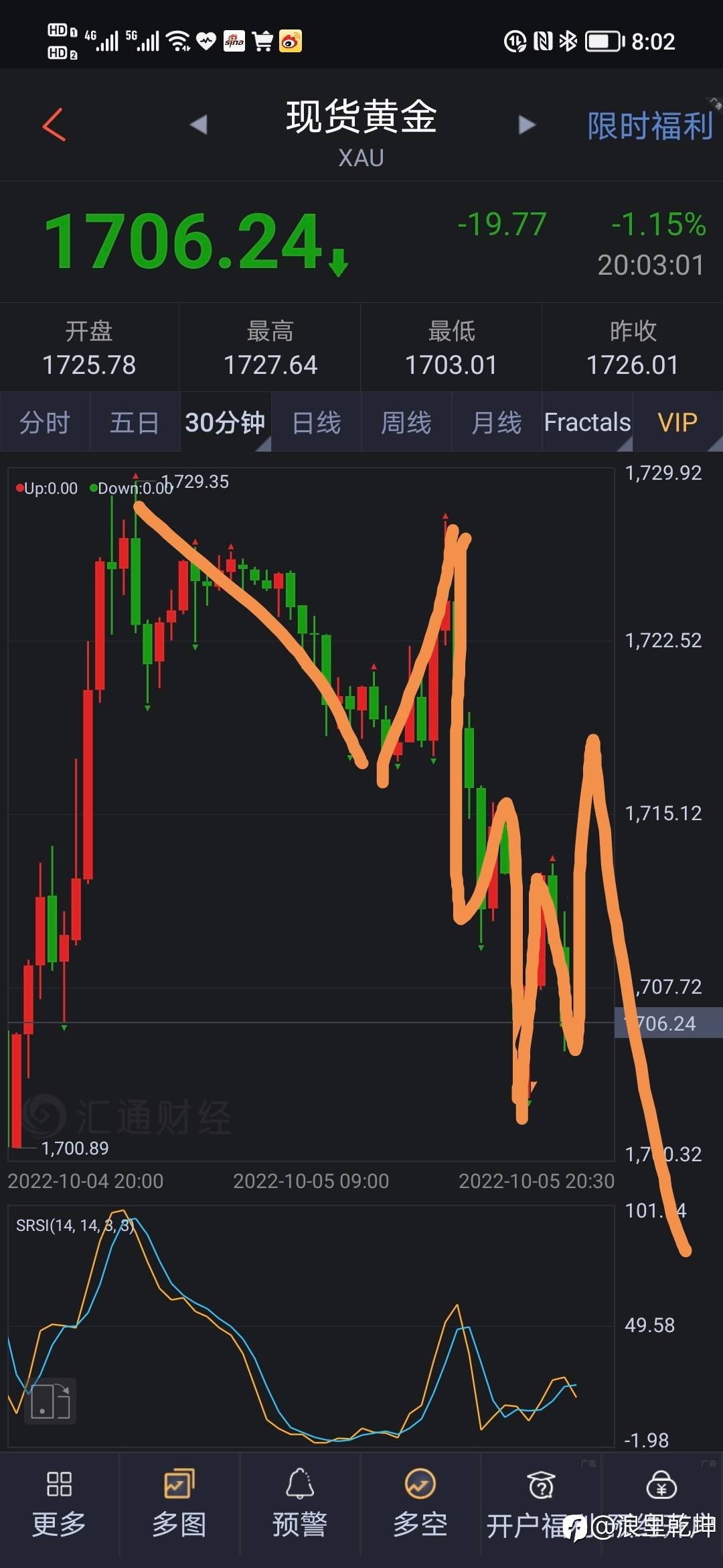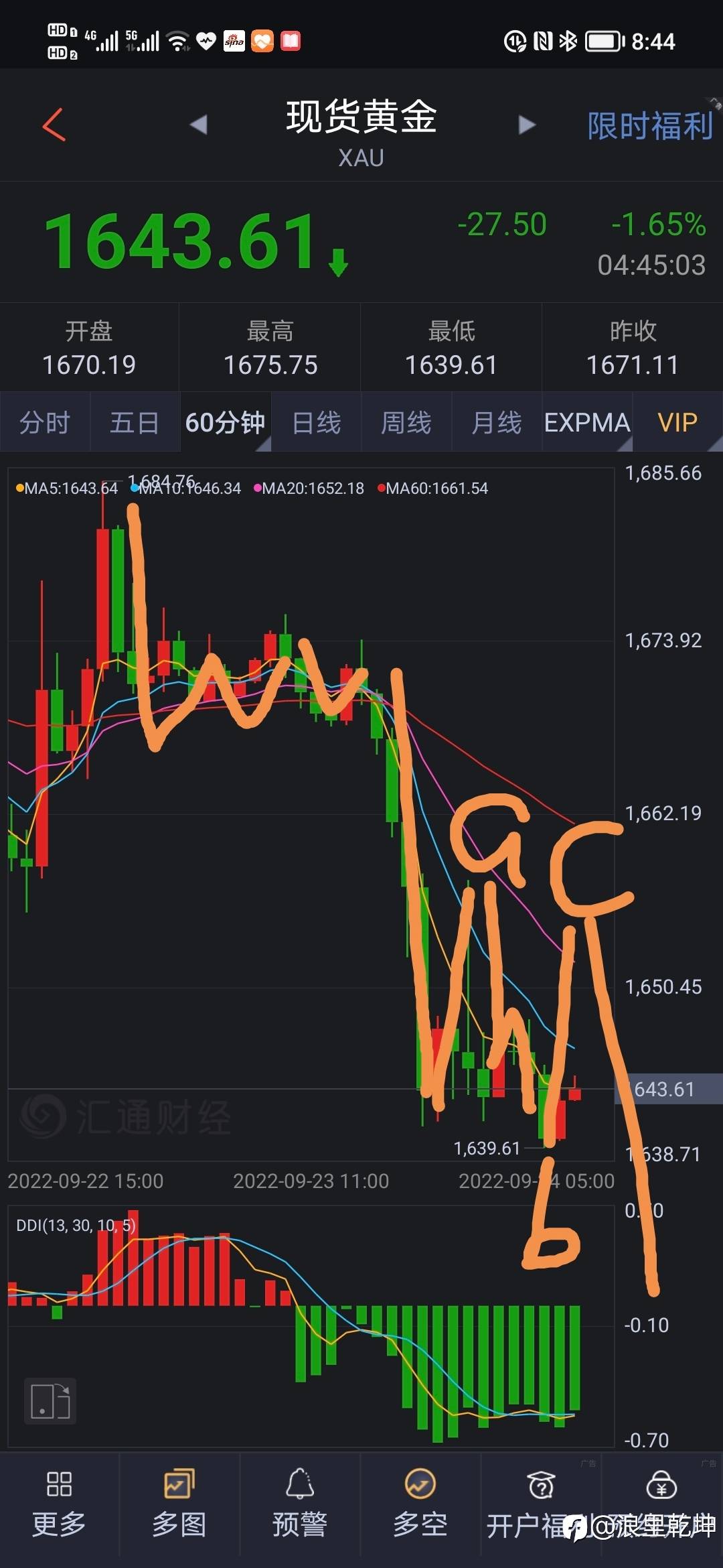 浪里乾坤 06 Oct 2022, 17:40 · 阅读量 861 关注 黄金波浪分析,不排除黄金第四子浪走双调整浪的可能性。就是再调整一次,阻力位1725。支持位置1695,因为黄金刚刚这一摔有这个迹象。如果不能快速收复1720之上就大概率走双重调整浪。 风险提示:本文所述仅代表作者个人观点,不代表 Followme 的官方立场。Followme 不对内容的准确性、完整性或可靠性作出任何保证,对于基于该内容所采取的任何行为,不承担任何责任,除非另有书面明确说明。 赞赏作者 喜欢的话,赞赏支持一下