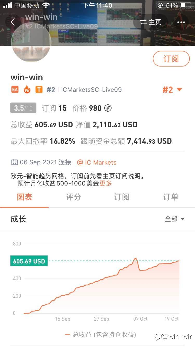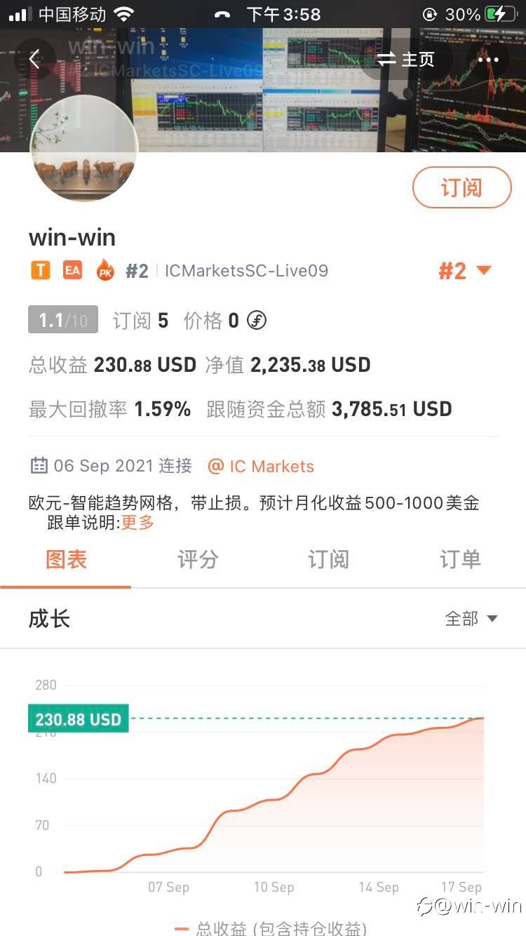 从小小顽皮大佬那里亏钱后,我急于找回损失,中间订阅了一个@小曾--财富 的信号,当时订阅价格是200美元的高价,当时也算利欲熏心吧,看到他的信号一个月能赚几千美元就没有考虑后果的增加杠杆订阅,第一天赚了100多美元就沾沾自喜,结果果然第二天就大亏损了,自己比较谨慎手动砍单了,亏损了几百美元,幸亏有订阅保障,订阅费后面退回了大半。