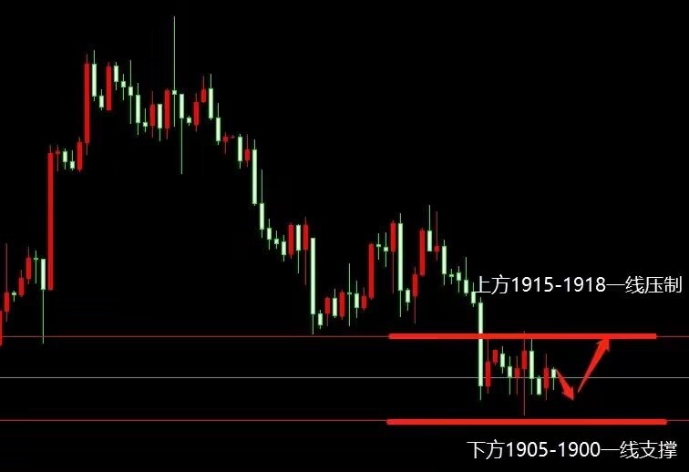 黄金操作建议:上方触及1995-1998一线做空,止损2005,目标点位1980-1985区域;下方回踩触及1968-1970区域做多一次,止损1965,目标点位1990上方;