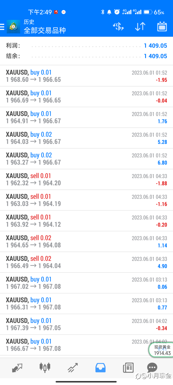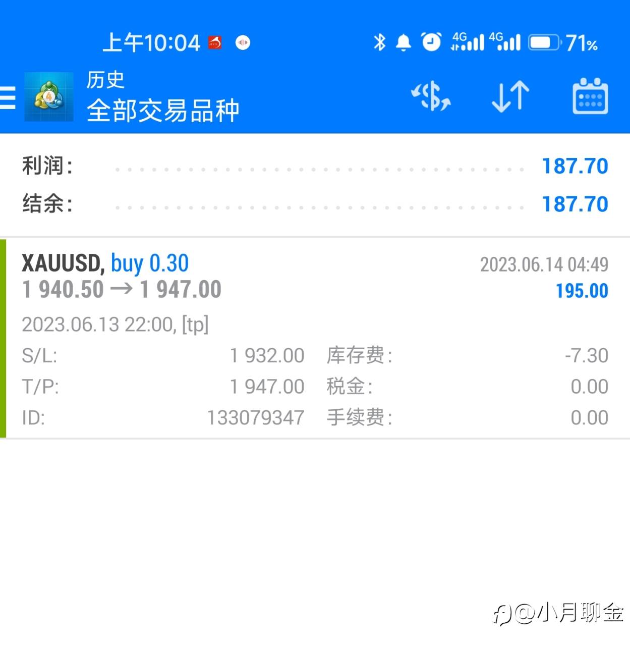 小月聊金 04 Jul 2023, 10:06 · 阅读量 929 关注 昨天是多空通吃的一天,专挑中间的美味吃,直接拿下638🔪咯 #XAU/USD# 风险提示:本文所述仅代表作者个人观点,不代表 Followme 的官方立场。Followme 不对内容的准确性、完整性或可靠性作出任何保证,对于基于该内容所采取的任何行为,不承担任何责任,除非另有书面明确说明。 赞赏作者 喜欢的话,赞赏支持一下