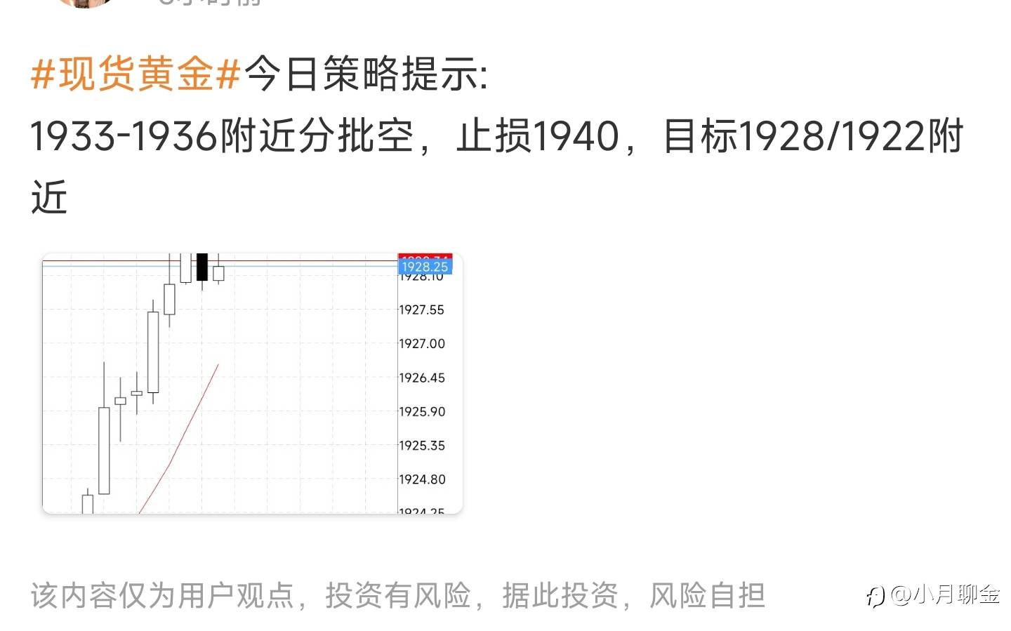 小月聊金 04 Jul 2023, 14:24 · 阅读量 969 关注 1921的多单先浅浅拿下五个点咯 #XAU/USD# 风险提示:本文所述仅代表作者个人观点,不代表 Followme 的官方立场。Followme 不对内容的准确性、完整性或可靠性作出任何保证,对于基于该内容所采取的任何行为,不承担任何责任,除非另有书面明确说明。 赞赏作者 喜欢的话,赞赏支持一下