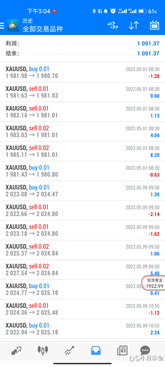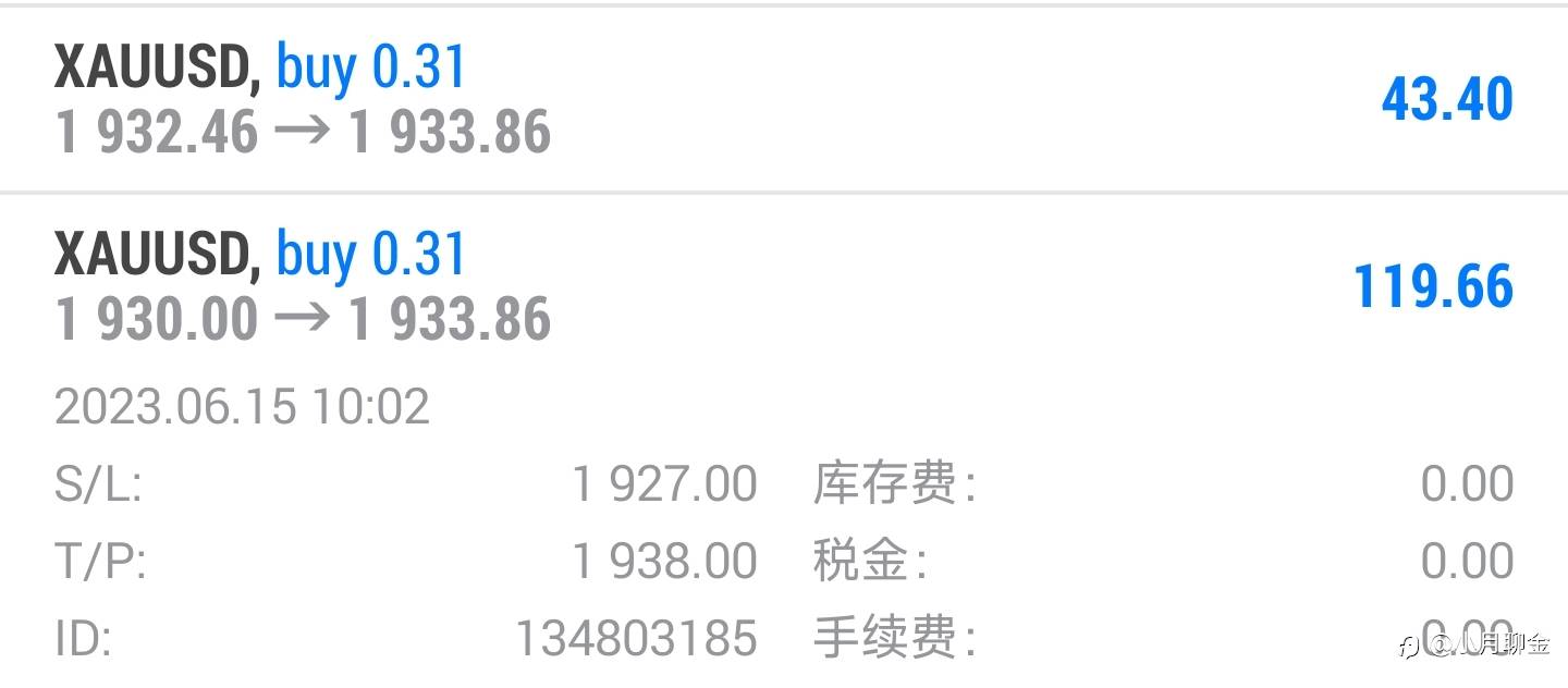 小月聊金 11 Jul 2023, 10:53 · 阅读量 968 关注 准时报告昨日收米情况~1915和1918的多单双双拿下,403🔪收入囊中 #XAU/USD# 风险提示:本文所述仅代表作者个人观点,不代表 Followme 的官方立场。Followme 不对内容的准确性、完整性或可靠性作出任何保证,对于基于该内容所采取的任何行为,不承担任何责任,除非另有书面明确说明。 赞赏作者 喜欢的话,赞赏支持一下