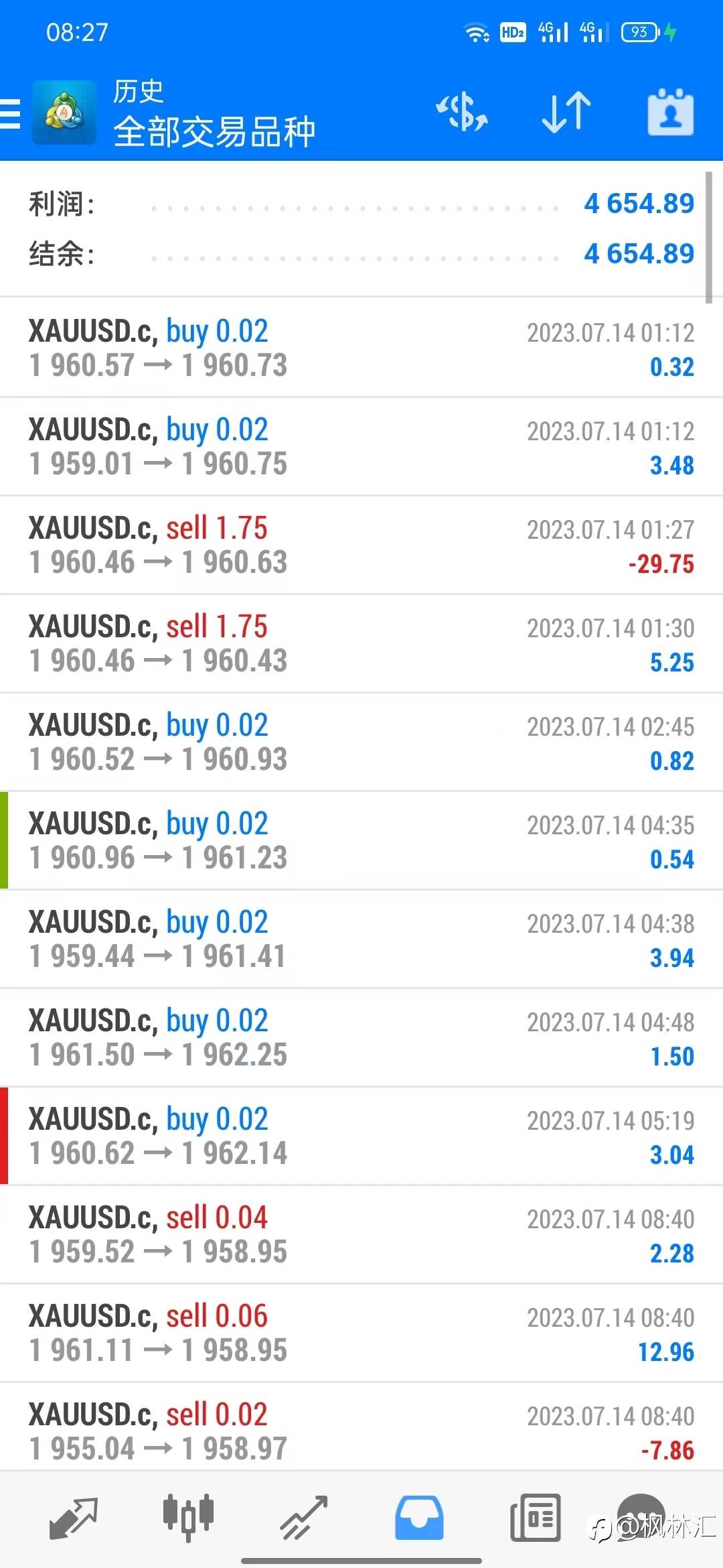 远的时间不说,6月19号行情刚有下跌的意图,近一点的7月6号就看4小时周期有底部头肩底形态的意思,而且颈线突破位看的是1932/33,结果等行情真正走出来破位颈线了,没做到多,反而套了空单,真不知道当时是怎么想的,所以有时候赏自己两个巴掌也是不亏的,加上这两天网站总是打不开,什么安全连接失败,就一直没有更新。下面的图是本周平仓单结果,持仓单就不展示了,大家可以从目前入金加载百分比变化就可以看出来,不过套单不可怕,只要能解出来或者行情整体方向没有变,剩下就是时间问题(套的都是手动单,EA单没多少)