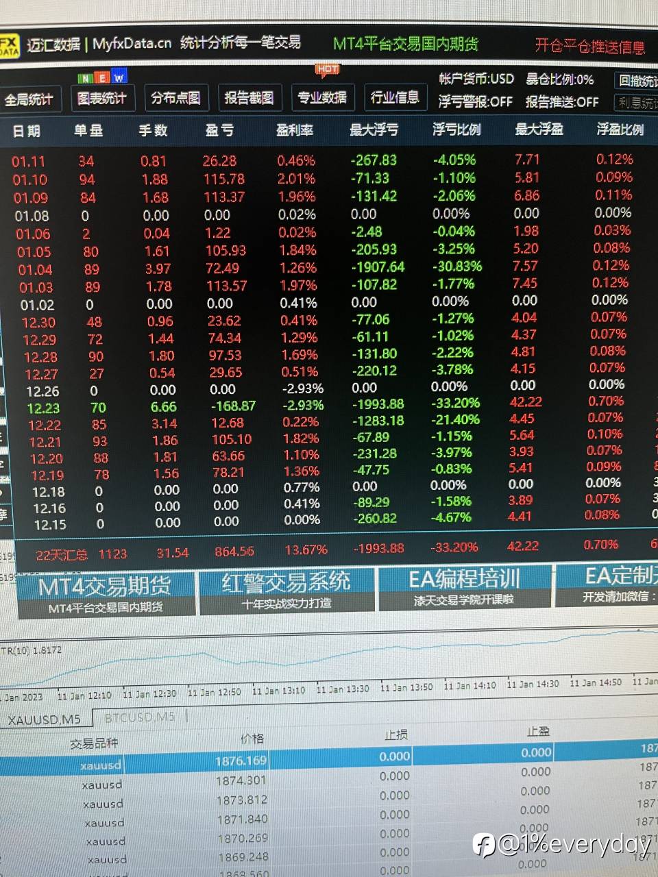 1、在这之前,先说一下最近半年的交易状况。就我本人来说,今年是过得比较惨的。3月份做马丁被大砍一波止损离场后,就开始做趋势,结果黄金迎来了长时间的震荡,震得半死不活,一直被洗,寻思搞个网格,不马丁的策略赚点小钱,赚钱了一两个月,九月底一波大趋势,怕死直接砍仓,又还回去了。连续被砍几次,上一年的利润差不多全还回去了,简直惨不忍睹。