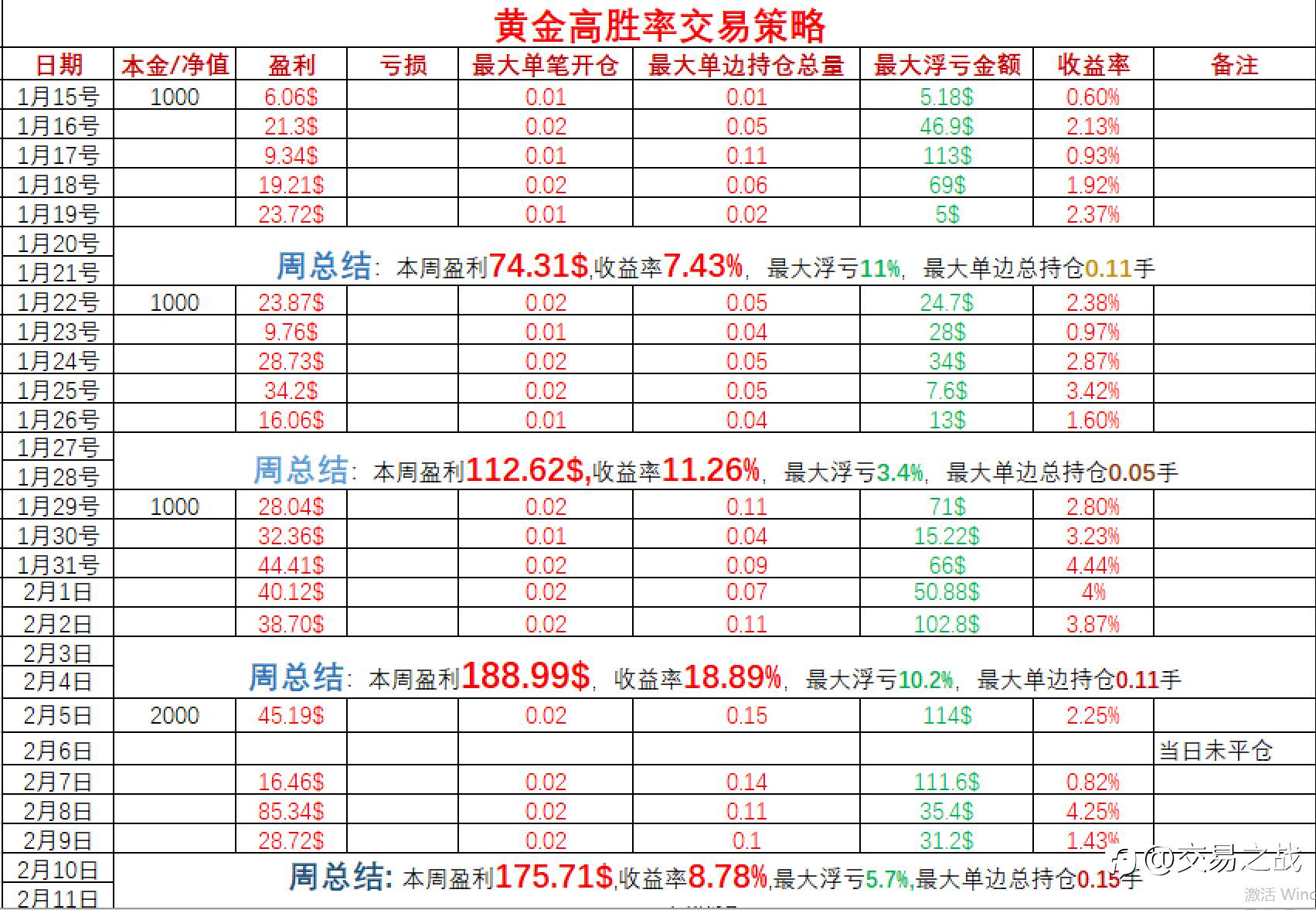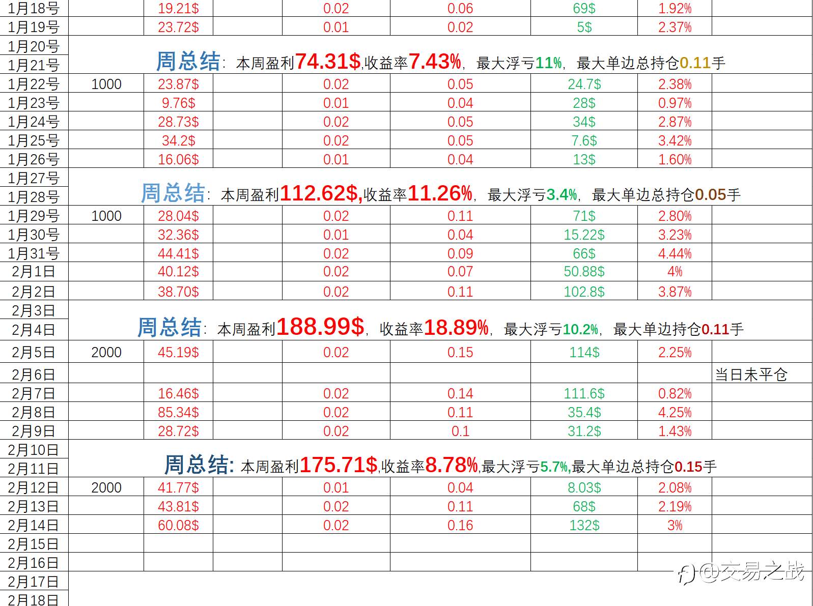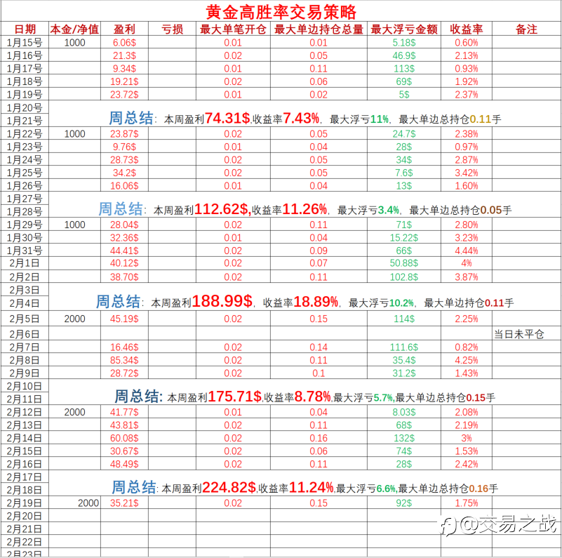 交易之战 02 Feb 2024, 10:07 · 阅读量 556 关注 1-昨日收益率4%2-昨日最大单笔开仓0.02手,最大单边总持仓0.07手!追求目标:仓位管理第一!盈利第二! 风险提示:本文所述仅代表作者个人观点,不代表 Followme 的官方立场。Followme 不对内容的准确性、完整性或可靠性作出任何保证,对于基于该内容所采取的任何行为,不承担任何责任,除非另有书面明确说明。 赞赏作者 喜欢的话,赞赏支持一下