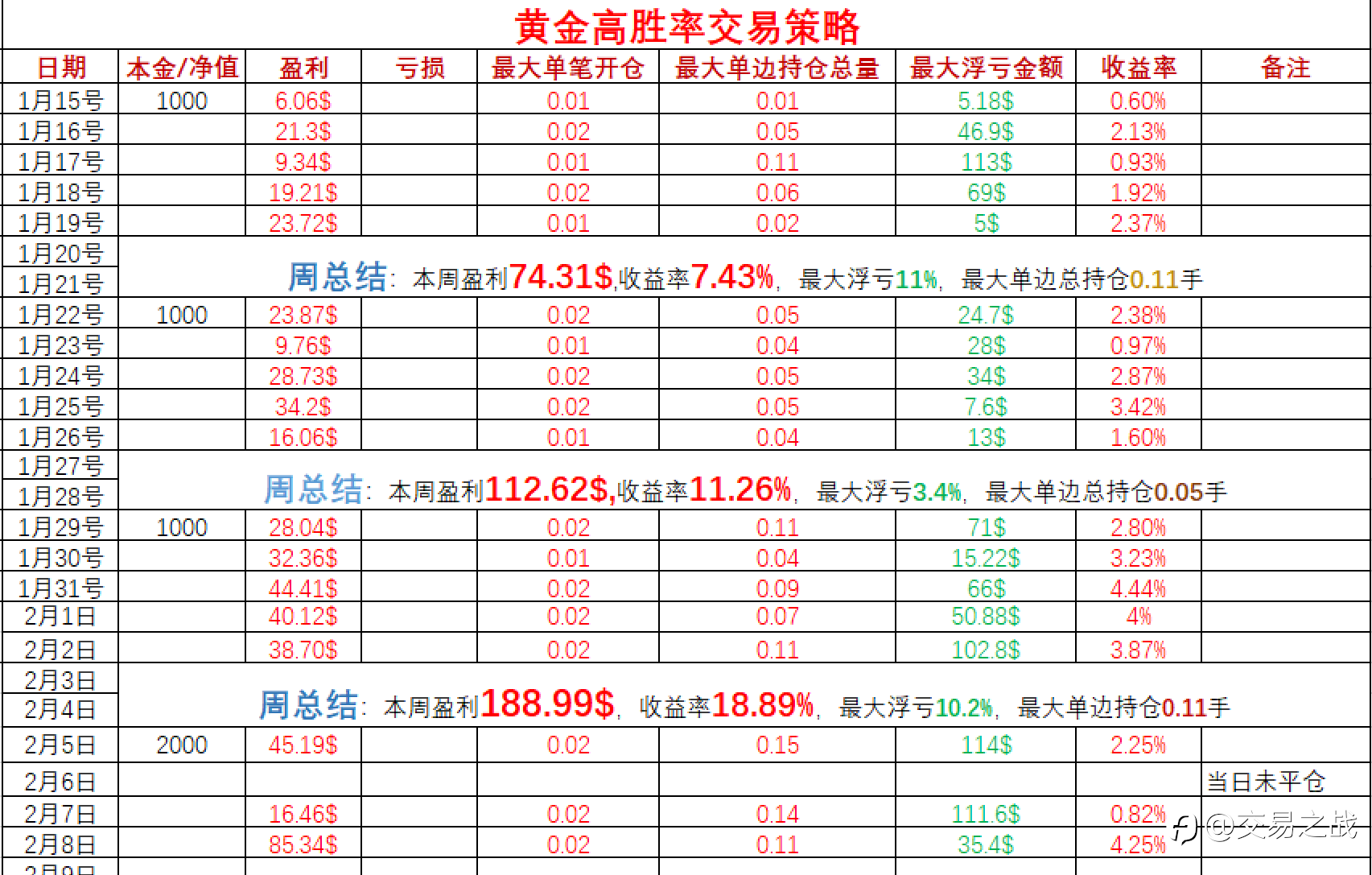 交易之战 27 Feb 2024, 14:07 · 阅读量 599 关注 1-昨日收益率1.51%2-昨日最大单笔开仓0.02手,最大单边总持仓0.08手!追求目标:仓位管理第一!盈利第二! 风险提示:本文所述仅代表作者个人观点,不代表 Followme 的官方立场。Followme 不对内容的准确性、完整性或可靠性作出任何保证,对于基于该内容所采取的任何行为,不承担任何责任,除非另有书面明确说明。 赞赏作者 喜欢的话,赞赏支持一下