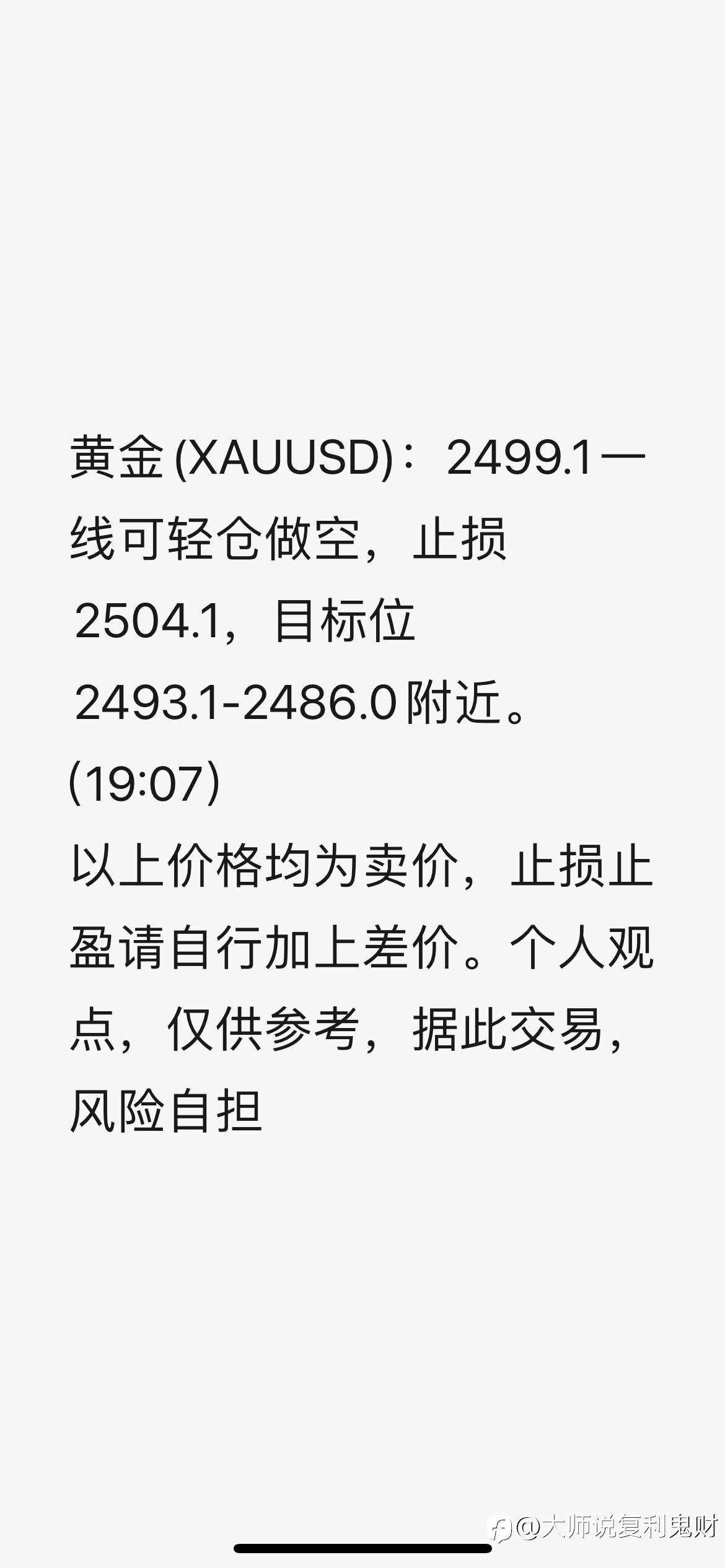 大师说复利鬼财 12 Jul 2024, 14:35 · 阅读量 464 关注 欢迎外汇朋友一起交流 风险提示:本文所述仅代表作者个人观点,不代表 Followme 的官方立场。Followme 不对内容的准确性、完整性或可靠性作出任何保证,对于基于该内容所采取的任何行为,不承担任何责任,除非另有书面明确说明。 赞赏作者 喜欢的话,赞赏支持一下