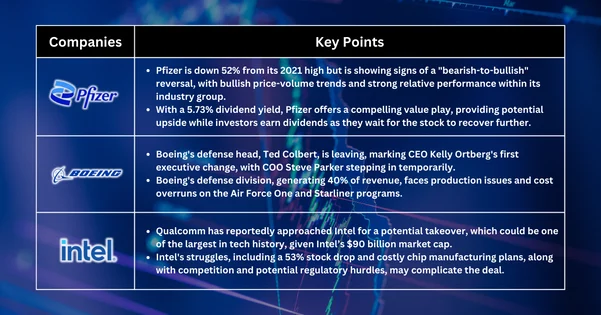 Pfizer is down 52% from its 2021 high and is showing signs of a "bearish-to-bullish" reversal. After several setbacks over the past three years, it's trading at $29.30. Recently, the stock has shown bullish price-volume trends and strong relative performance within the S&P 500 Pharmaceuticals Industry Group. Pfizer appears to be a compelling value play with a 5.73% dividend yield, offering potential upside while investors "get paid" to wait for further recovery.