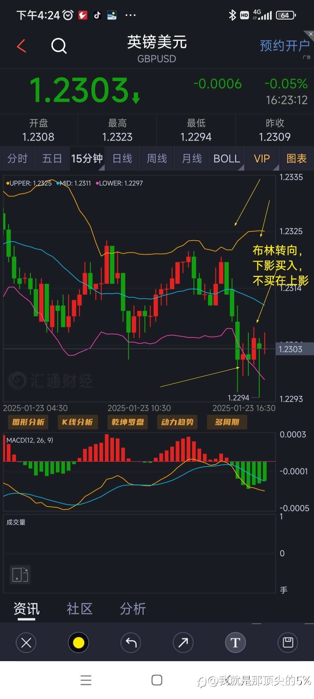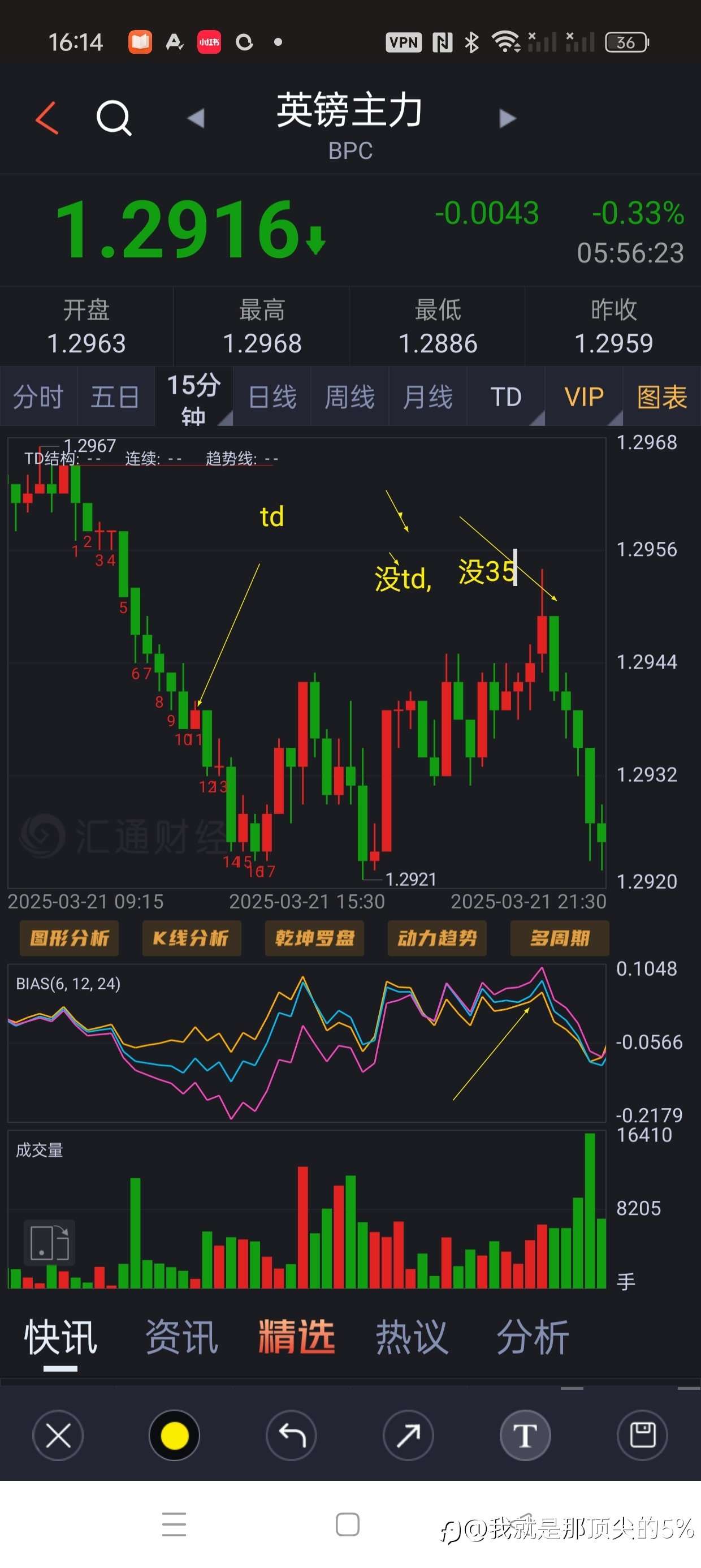 我就是那顶尖的5% 10 Oct 2024, 22:47 · 阅读量 166 关注 怎样确定一天是趋势还是盘整?低成交量确定是盘整。镑昨天15分钟最大量少于3000,欧元小于5000,又无重大数据驱动。在盘整出td小趋势,然后死猫跳,接着长阴,这样的走势出现了三次。 风险提示:本文所述仅代表作者个人观点,不代表 Followme 的官方立场。Followme 不对内容的准确性、完整性或可靠性作出任何保证,对于基于该内容所采取的任何行为,不承担任何责任,除非另有书面明确说明。 赞赏作者 喜欢的话,赞赏支持一下
