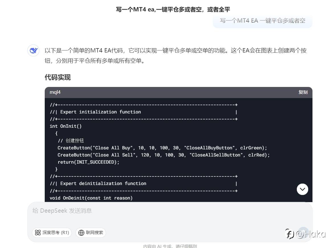 以前随便找人写个EA不得花个几百,甚至上千不只。有了DeeSeek,得砸掉多少人饭碗。多少人失业。举个最简单的例子: