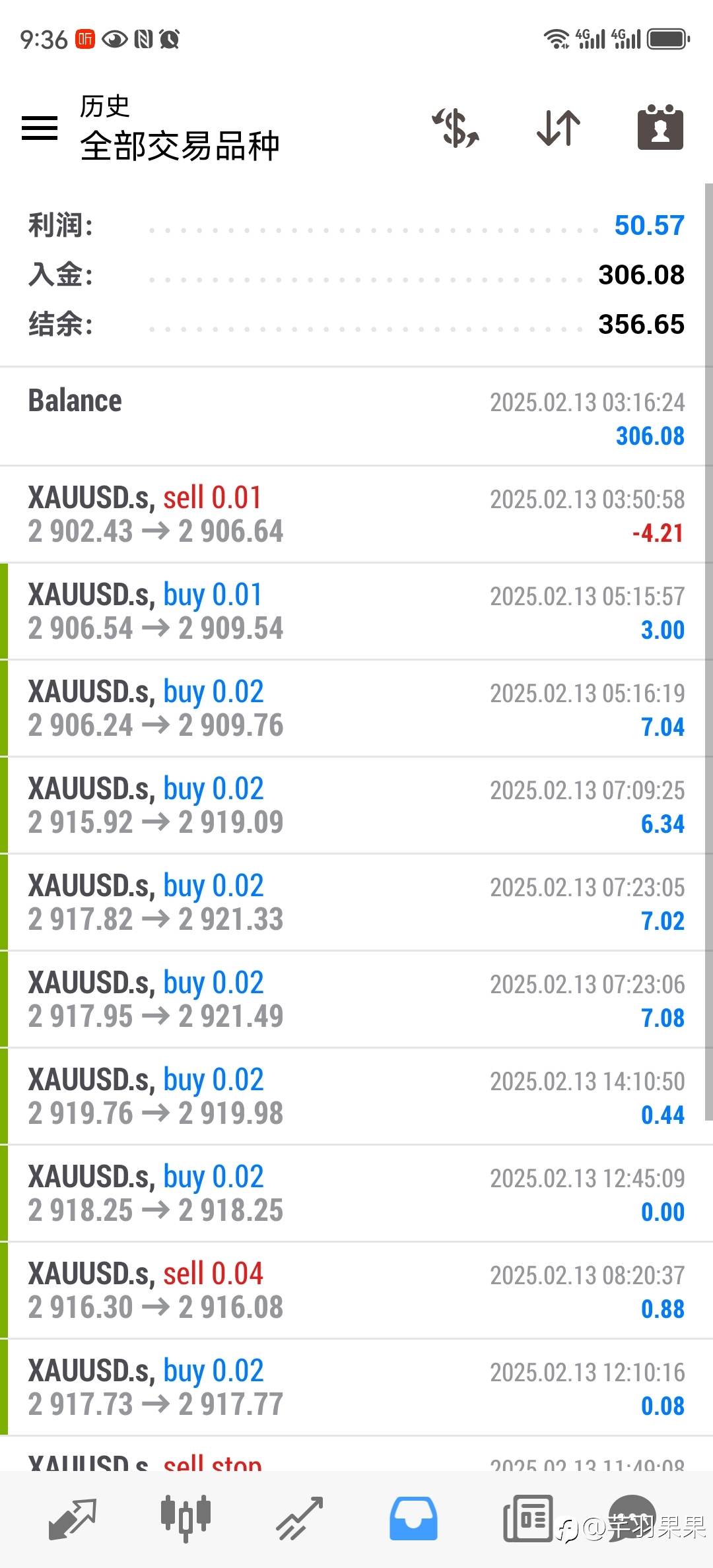 芊羽果果 21 Feb 2025, 09:17 · 阅读量 567 关注 这几天用EA开单,但是行情变化快,开进去的单子难免浮亏,我的办法果断止损,反向重仓一点盈利掉亏损小赚出局,不能贪。昨天突然想明白一个问题,真正体现交易员的能力是处理浮亏单子的能力,而这个能力必须建立在完善的交易系统上😊😊😊 风险提示:本文所述仅代表作者个人观点,不代表 Followme 的官方立场。Followme 不对内容的准确性、完整性或可靠性作出任何保证,对于基于该内容所采取的任何行为,不承担任何责任,除非另有书面明确说明。 赞赏作者 喜欢的话,赞赏支持一下