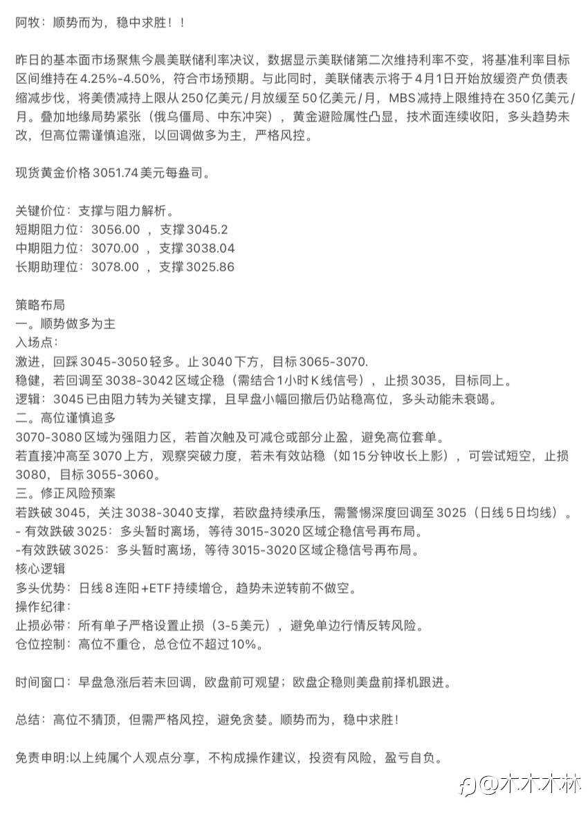 木木木林 05 Mar 2025, 10:58 · 阅读量 163 关注 #黄金外汇解盘# 看起来是要收口(形势不明) 风险提示:本文所述仅代表作者个人观点,不代表 Followme 的官方立场。Followme 不对内容的准确性、完整性或可靠性作出任何保证,对于基于该内容所采取的任何行为,不承担任何责任,除非另有书面明确说明。 赞赏作者 喜欢的话,赞赏支持一下
