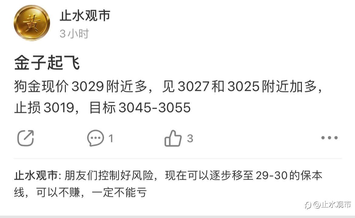 止水观市 27 Mar 2025, 15:40 · 阅读量 185 关注 狗金现价3029附近多,见3027和3025附近加多,止损3019,目标3045-3055 风险提示:本文所述仅代表作者个人观点,不代表 Followme 的官方立场。Followme 不对内容的准确性、完整性或可靠性作出任何保证,对于基于该内容所采取的任何行为,不承担任何责任,除非另有书面明确说明。 赞赏作者 喜欢的话,赞赏支持一下