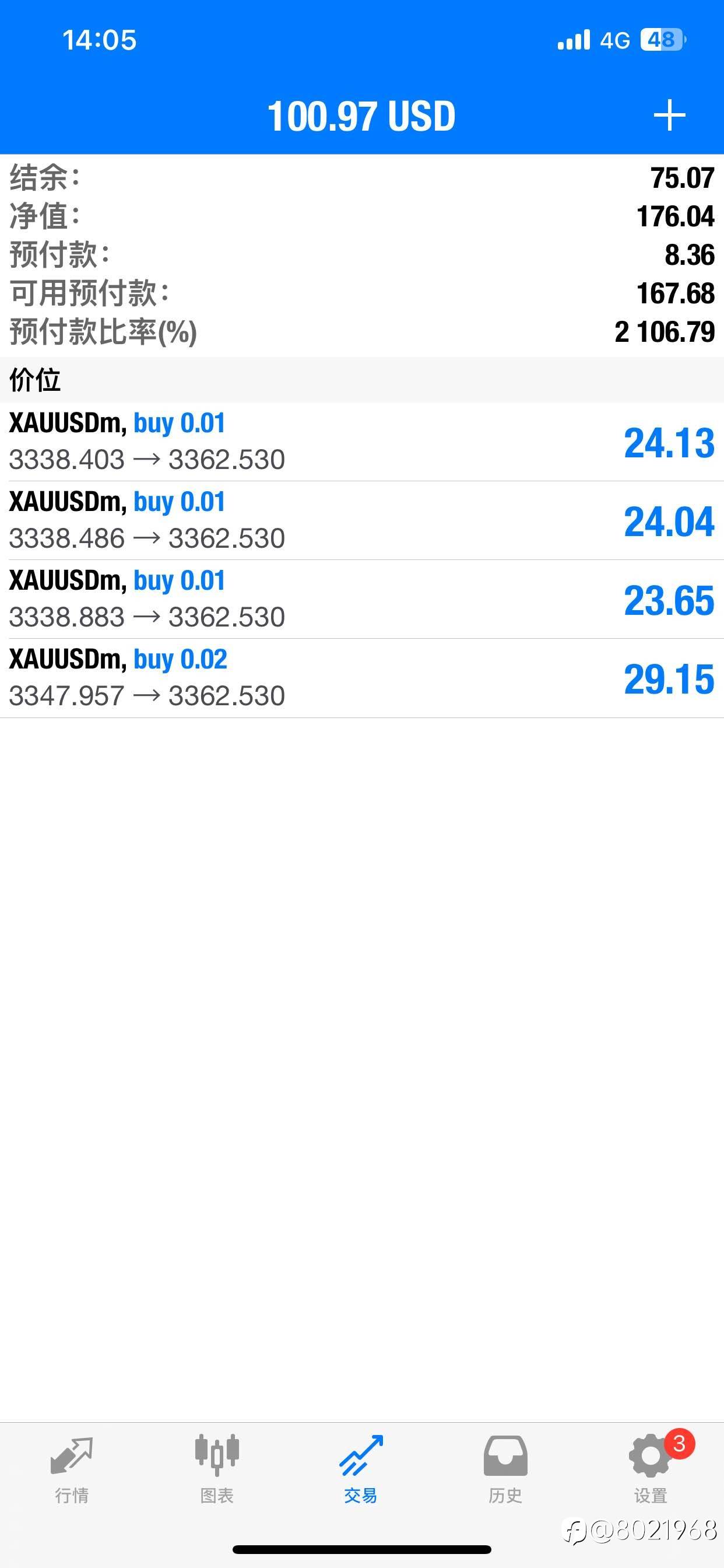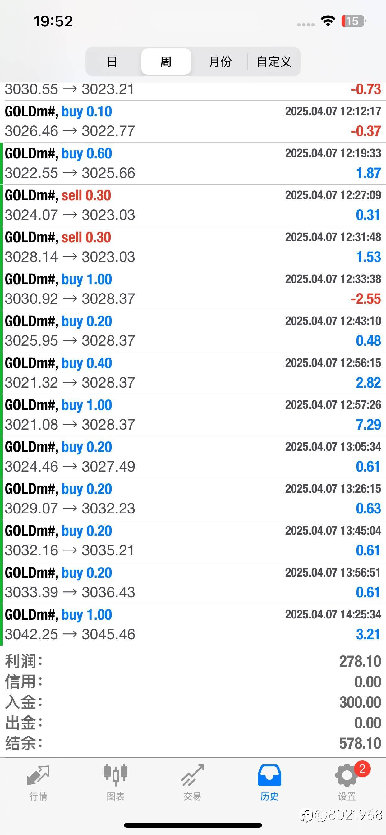 8021968 07 Apr 2025, 19:54 · 阅读量 144 关注 此帐号是XM的迷你低点差帐户,1手=标准帐户的0.01手,跟单最好用同平台同帐户类型!上周五入300u启动。如没开过xm的可填我的邀请码 J26KD 风险提示:本文所述仅代表作者个人观点,不代表 Followme 的官方立场。Followme 不对内容的准确性、完整性或可靠性作出任何保证,对于基于该内容所采取的任何行为,不承担任何责任,除非另有书面明确说明。 赞赏作者 喜欢的话,赞赏支持一下