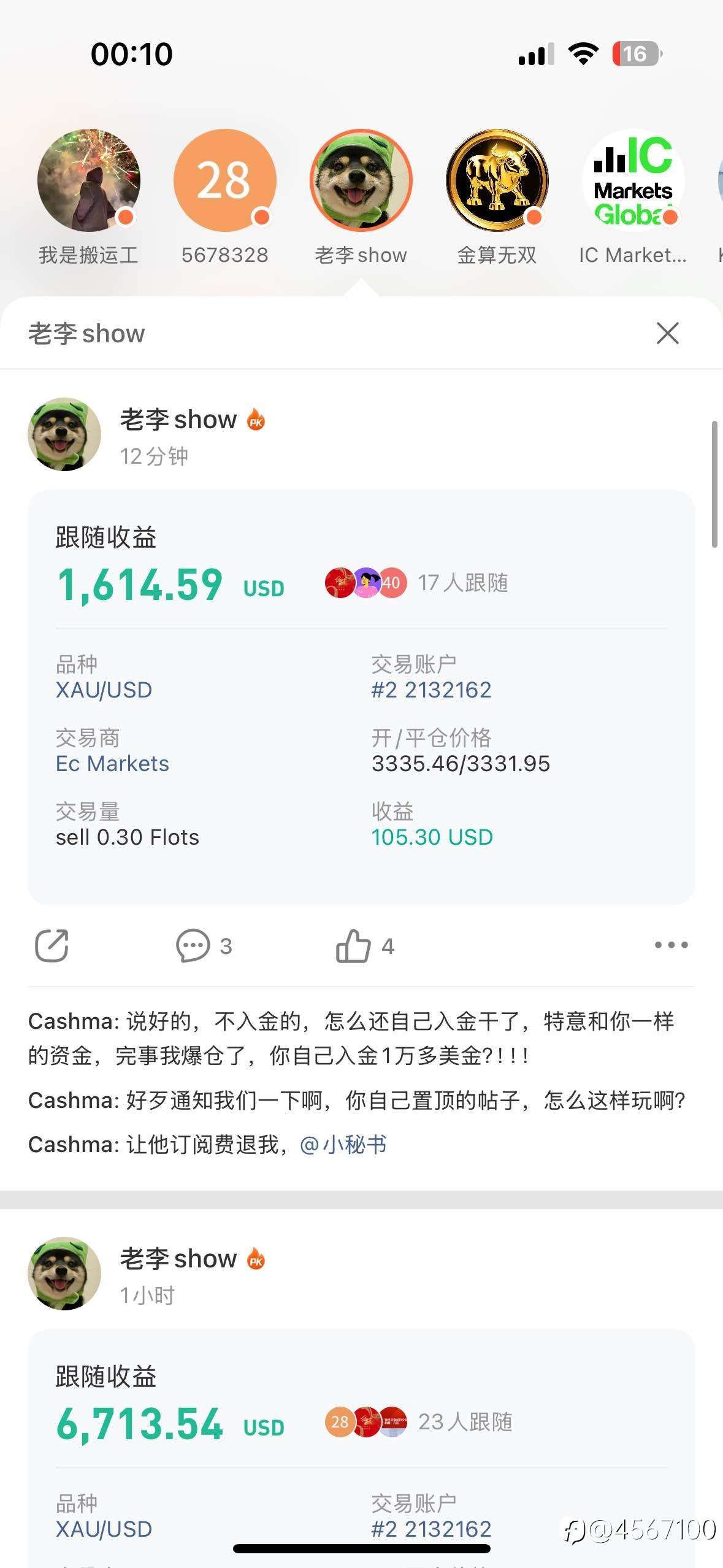 4567100 07 Jun 2025, 00:13 · 阅读量 346 关注 都是高手,偷摸的自己 入金,跟他单的基本全军覆没了,大家要小心! 风险提示:本文所述仅代表作者个人观点,不代表 Followme 的官方立场。Followme 不对内容的准确性、完整性或可靠性作出任何保证,对于基于该内容所采取的任何行为,不承担任何责任,除非另有书面明确说明。 赞赏作者 喜欢的话,赞赏支持一下
