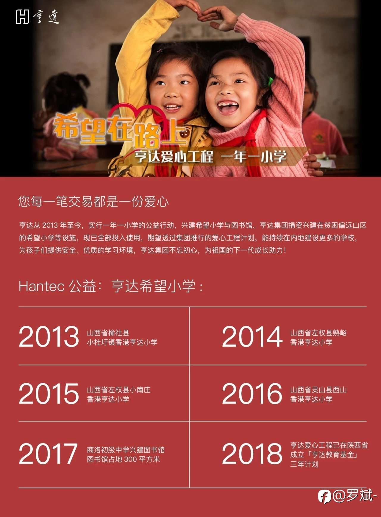 重庆市暴雨成灾,多区有洪涝,政府需疏散大量居民及进行紧急救援。亨达集团迅速回应救灾,联络中联办瞭解灾情,并向受灾最严重的重庆市秀山土家族苗族自治县灾区捐出港币100万元,聊表心意。