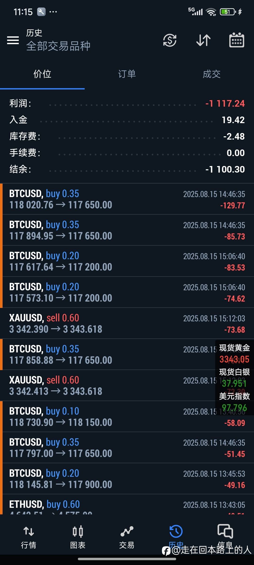 走在回本路上的人 07 Aug 2025, 17:55 · 阅读量 508 关注 刚刚发过一遍不知道咋搞得没通过,640多字左右可惜了,这波简化一下就是40倍纪念一下,分仓后没对冲上头了爆仓了剩下的224刀,看对了非美没坚持住,靠运气赚的都换给了市场 风险提示:本文所述仅代表作者个人观点,不代表 Followme 的官方立场。Followme 不对内容的准确性、完整性或可靠性作出任何保证,对于基于该内容所采取的任何行为,不承担任何责任,除非另有书面明确说明。 赞赏作者 喜欢的话,赞赏支持一下