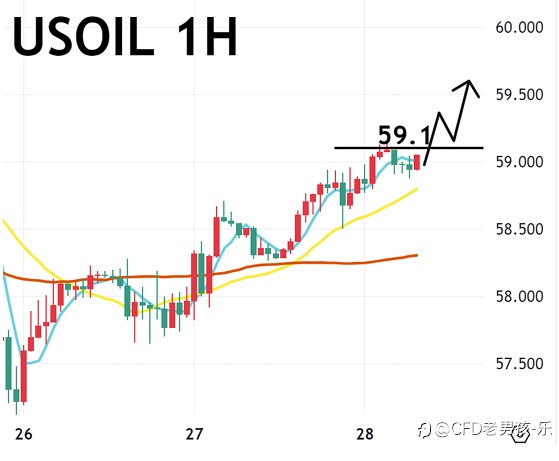 道指一小时图,均线呈现空头排列,MA5上扬接近MA20,多空正在角力,走势震荡整理,考量到前段短多走势,格局仍偏多,故待多方动能转强,突破短压后,再伺机追多。