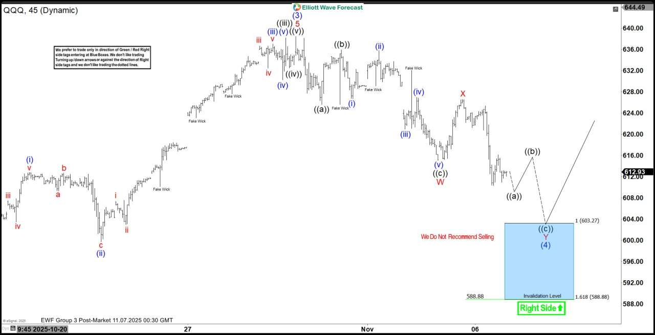 In the 1-hour Elliott Wave count from Nov 07, 2025, we saw that $QQQ completed a 5-wave impulsive cycle at blue (3). As expected, this initial wave prompted a pullback. We anticipated this pullback to unfold in 7 swings, likely finding buyers in the equal legs area between $603.27 and $588.88.