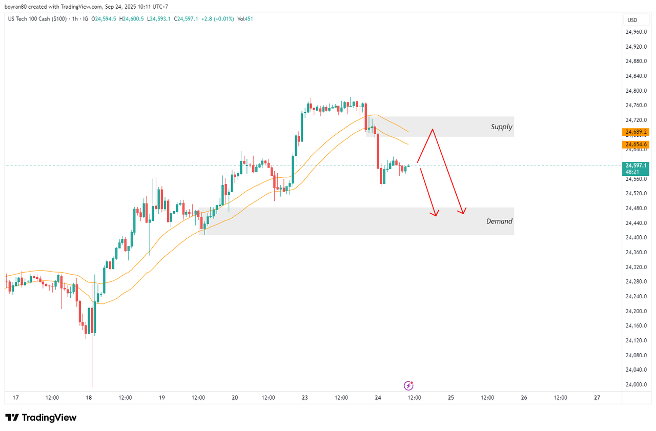 Pada grafik sebelah kiri (time frame H2), harga bergerak dalam trend naik yang jelas dengan EMA 50 berperan sebagai penyangga trend. Area yang ditandai lingkaran menunjukkan momen ketika harga kembali turun menyentuh EMA 50 dan mulai membentuk candlestick kecil yang saling bertumpuk. Ini menandakan fase koreksi sehat, bukan pembalikan trend, karena struktur besar masih menunjukkan higher low yang selaras dengan arah trend naik.