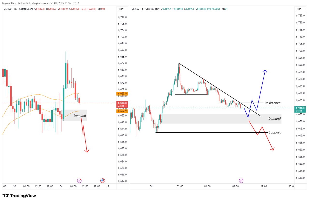 Masuk ke grafik sebelah kanan (time frame M15), area yang sama terlihat jauh lebih detail. Koreksi pada H2 tadi ternyata membentuk zona resistance yang ditembus, kemudian harga melakukan pullback ke key zone sebelum memantul naik. Di sinilah detail reversal muncul: break resistance → retest ke zona sebelumnya → candle bullish konfirmasi. Kombinasi ini memberi sinyal entry yang jauh lebih presisi dibanding sekadar masuk begitu harga menyentuh EMA di H2.