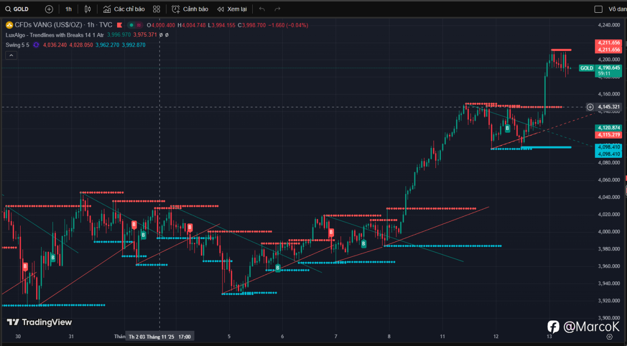 - Có setup bullish breakout trên 1h, mô tả vàng bật mạnh từ vùng hỗ trợ 4180–4200, hiện reclaim lại zone 4.20x và nhắm vùng thanh khoản 4260 & 4300.