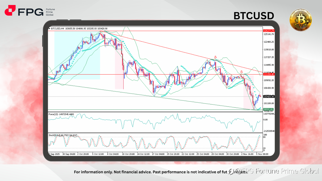 4. Indicators: Parabolic SAR dots have shifted beneath price, indicating strong bullish momentum. Bollinger Bands are expanding, reflecting heightened volatility with candles hugging the upper band. The Force Index shows a notable spike, revealing strengthened buying pressure. MACD histogram bars continue rising with widening separation between the MACD and signal line, confirming sustained bullish momentum with no immediate signs of reversal.