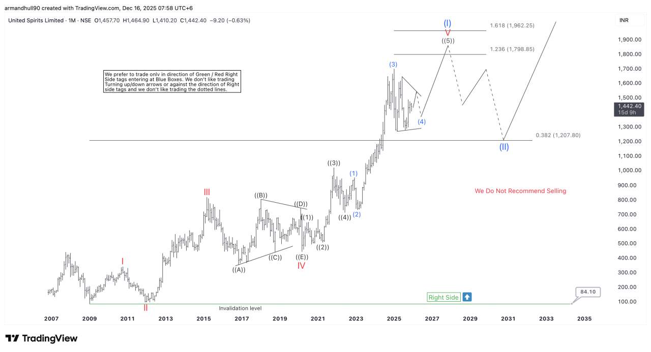 In conclusion, United Spirits Limited continues to hold a bullish Elliott Wave setup supported by clear Fibonacci relationships. Short-term corrections may appear, but they form part of a broader upward cycle. The overall structure continues to favor long-term bullish opportunities rather than weakness.
