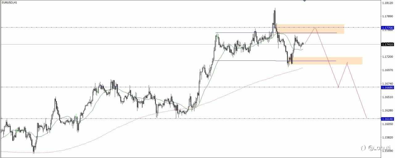 Vùng bán có thể được cân nhắc là quanh phạm vi 1.17675/1.1770 - cạnh trên của biên tích lũy hợp lưu với supplyzone trên. STP đỉnh giá 1.1803. Mục tiêu giá hướng về 1.1705 (đáy giá hôm qua) và 1.1668.