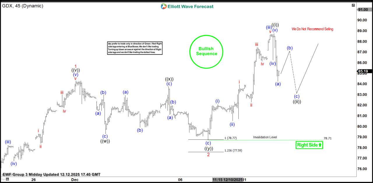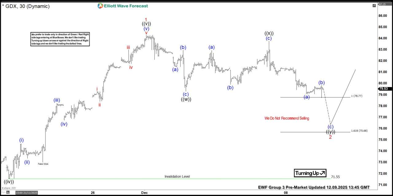 In the 1-hour Elliott Wave count from Dec 09, 2025, we saw that $GDX completed a 5-wave impulsive cycle at red 1. As expected, this initial wave prompted a pullback. We anticipated this pullback to unfold in 7 swings, likely finding buyers in the blue box equal legs area between $78.77 and $75.68.