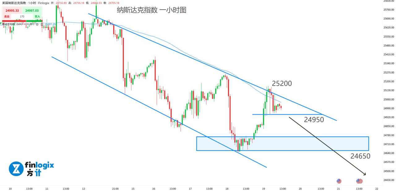 技术面:100均线保持向下,下行通道结构完整,交易策略以顺势做空为主。考虑到美光科技的利好,纳指空单尽量配合突破动能。由于风险集中,纳指一旦跌破前低点,可能一路暴跌至24000大关。