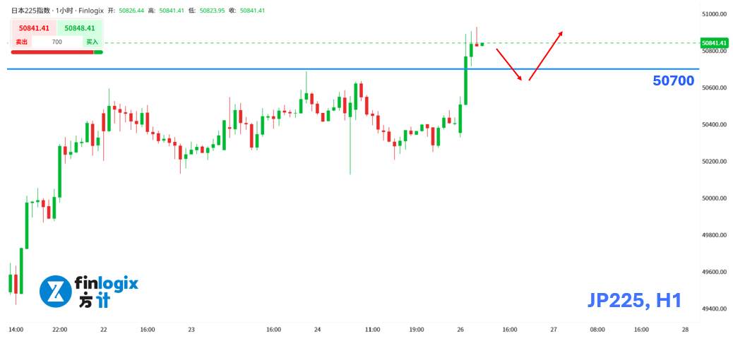 技术面:日本今早公布的失业率与东京核心 CPI优于预期,激励日经指数向上突破,日内可保持偏多操作思路,逢回调至 50,500~50,700 点 区间可寻找买入机会。不过需留意,日银可能介入市场干预日元,即便是透过口头干预,也可能促使日元升值,进而不利日经指数延续上涨格局。